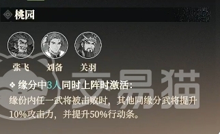 当刘关张三兄弟一起上阵时,他们之间会产生奇妙的羁绊反应,他们的组合不仅可以减免战意,提高生存能力,还能通过收割者天赋与关羽自身的高额伤害相配合,实现连杀效果,这种组合在战场上的效果还是值得考虑一下的,所以在配队的时候这一点大家就要考虑到,而且关羽的技能更是强大无比,他能够对敌方任一目标造成214%,这个数值在4星后会升至234%,此时高倍率的物伤还是很管用的,并且这次攻击还会获得30%暴伤加成。