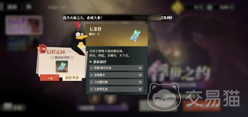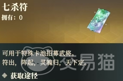 七杀符是大家抽卡的时候需要消用到的,一般可以购买获取,200三山璧来买七杀符,一般是在浮世之约这个卡池当中大家会用到这个抽卡道具,因为其中有保底机制,所以抽卡的次数需要很多,如果想要触发这个保底,大家就需要准备很多的七杀符。