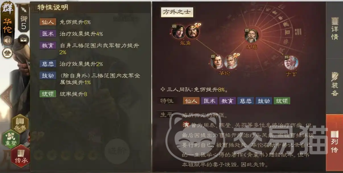 在阵容搭配方面,SP华佗有着多样的选择,与羁绊中的其他两个武将可组成方外之士羁绊队,再搭配袁术等武将,4方外之士的羁绊效果,加上袁术的免伤技能以及各类防御光环,能够大幅提升队伍的生存能力,队伍的输出主要依赖SP张角以及召唤兵,在群毒队中,SP华佗与于吉可组成治疗保护核心,搭配沮授、袁术、李儒等输出武将,借助SP华佗的免伤、免死和驱散能力,维持队伍的血线健康,保障输出武将能够持续进行叠毒输出,发挥队伍的最大战斗力。