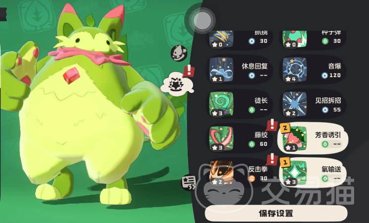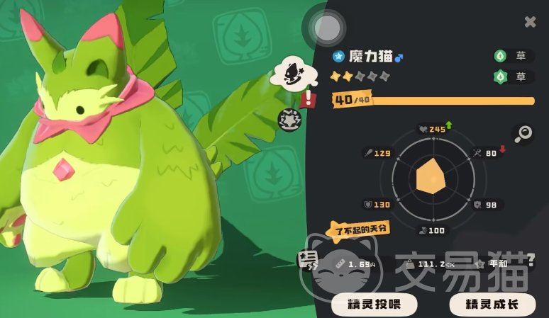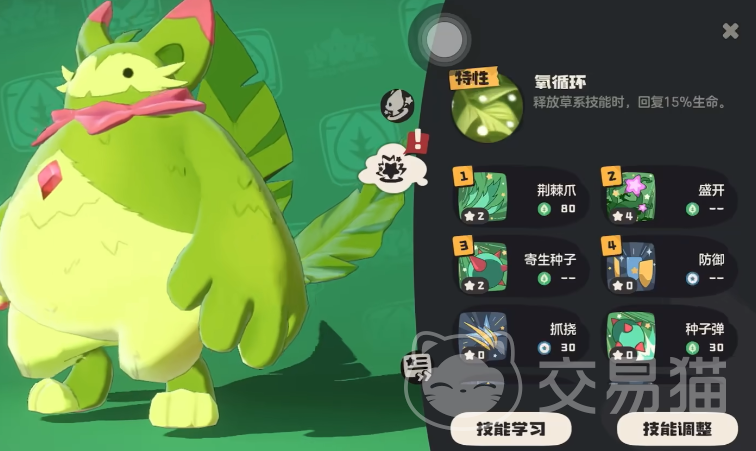 魔力猫是喵喵的进化体,这是一个草系精灵,相对来说各属性是比较均衡的,不只适合生存,同时角色非常适合消耗战,就是因为角色的特性是可以在释放技能的时候,恢复15%的生命值,非常适合新手去使用,使用这个角色可以用寄生种子、光合作用,藤绞,这几种技能组合起来,使用寄生种子之后,就可以在每回合吸血8%,藤绞主要的作用是在对战的过程中不断积累能量,光合作用可以维护角色的血量,这几个技能组合起来,就可以让角色的血量不断提升。