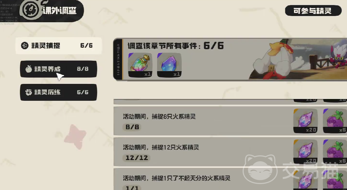 在完成了这上述两个捕捉任务后,玩家直接打开课外调查的面板,随后点击精灵历练这一个页面,就可以获取任务奖励。
