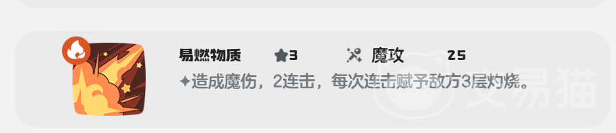 造成25点的魔法伤害 每一次技能都会对敌人进行2连击,每次连击都会给敌人附加上3层灼烧。