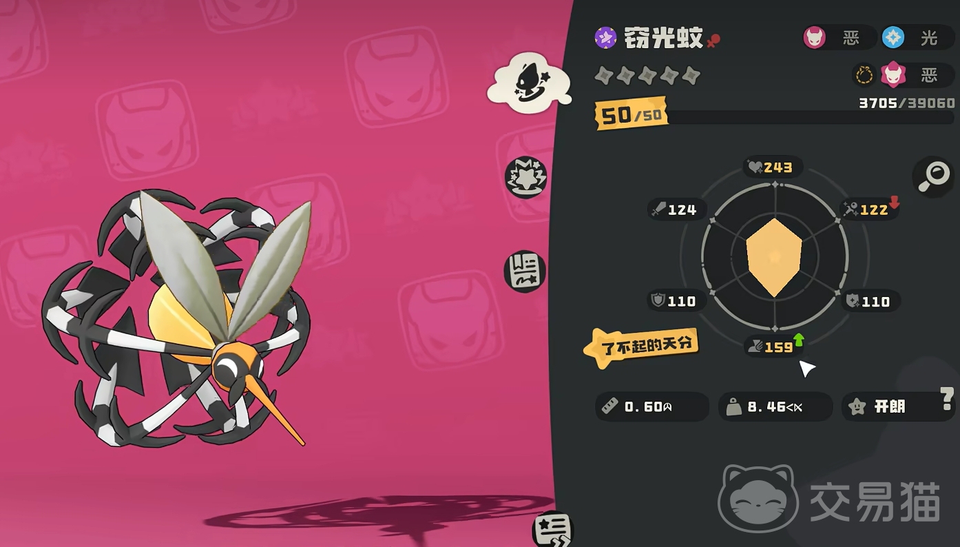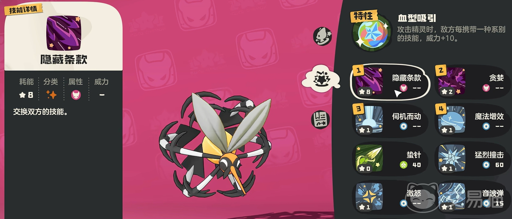 单从种族值等方面来看,窃光蚊的强度并不算强势,但它在升到五十级后,会解锁隐藏条款这个技能,能交换双方的技能,使得boss无法再放出强力技能,能极大地降低人们在boss战中的风险,而这也是窃光蚊会在boss战中变得流行的原因。因此,在搭配技能时,也需要围绕隐藏条款这个技能来进行。