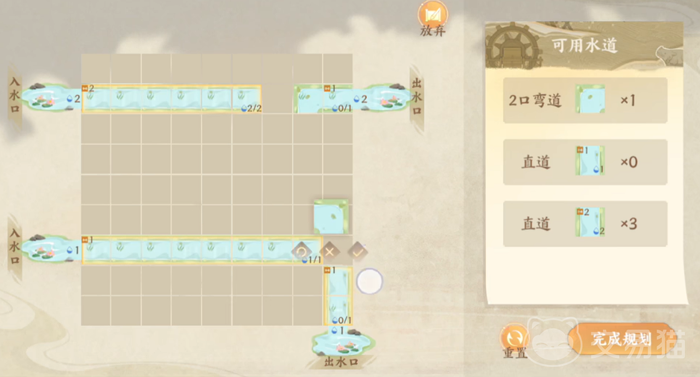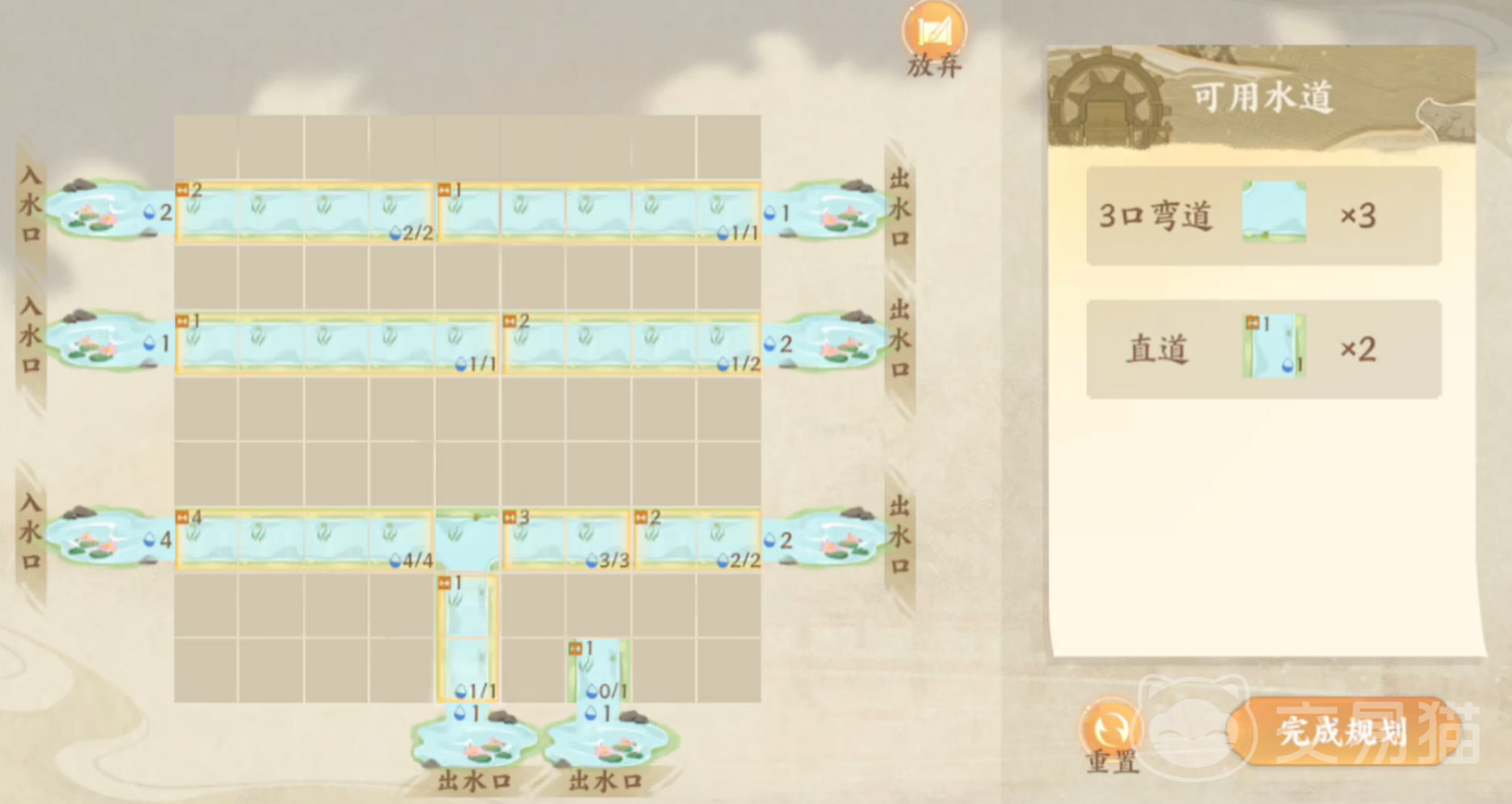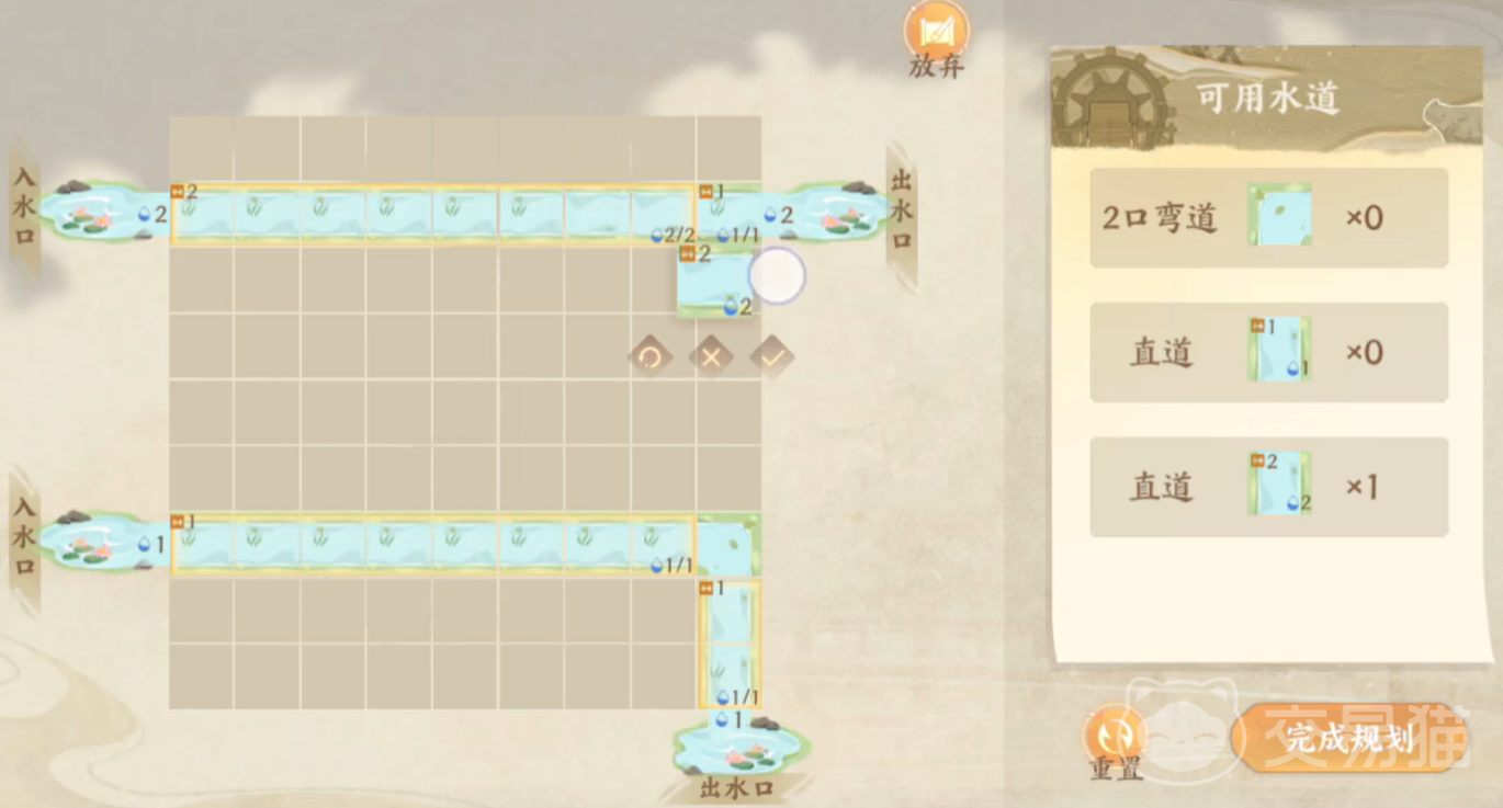 不过,这并不是全部。有些关卡还会加入特殊地块,像是森林和池塘。森林是一种障碍,无法放置水道,但池塘却是一个可以为你提供独特帮助的地方。池塘的作用是水流可以进入池塘,但池塘中的水流也会有输出,影响着周围水道的水流分配。合理利用池塘,可以让你在复杂的关卡中找到突破口,达到意想不到的效果。