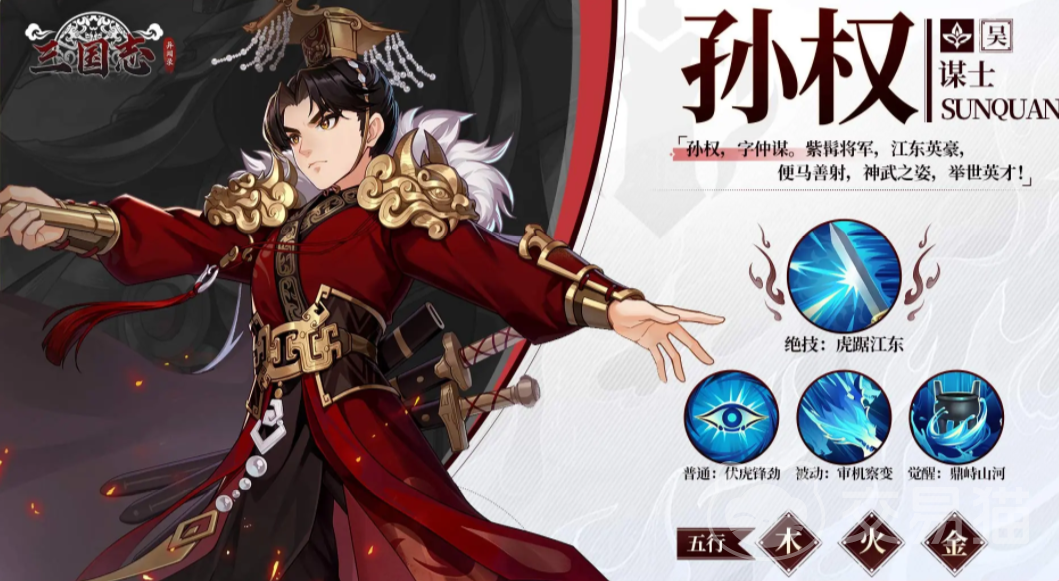 孙权在游戏里属于吴国阵营,初始状态下是水属性,这个属性最大的特点就是可以治疗自身,并且给对方带来伤害,另外角色在到80级之后,可以解锁金属性,这个属性同时也能给对方带来更大的伤害,另外还会拥有一定的简易效果,等角色提升到100级之后就可以激活火属性,这种属性也会给敌人带来大量的伤害,几乎这几个五行的设定玩家应该也能发现角色虽然是一个谋士,但是战斗力还是比较优秀的。