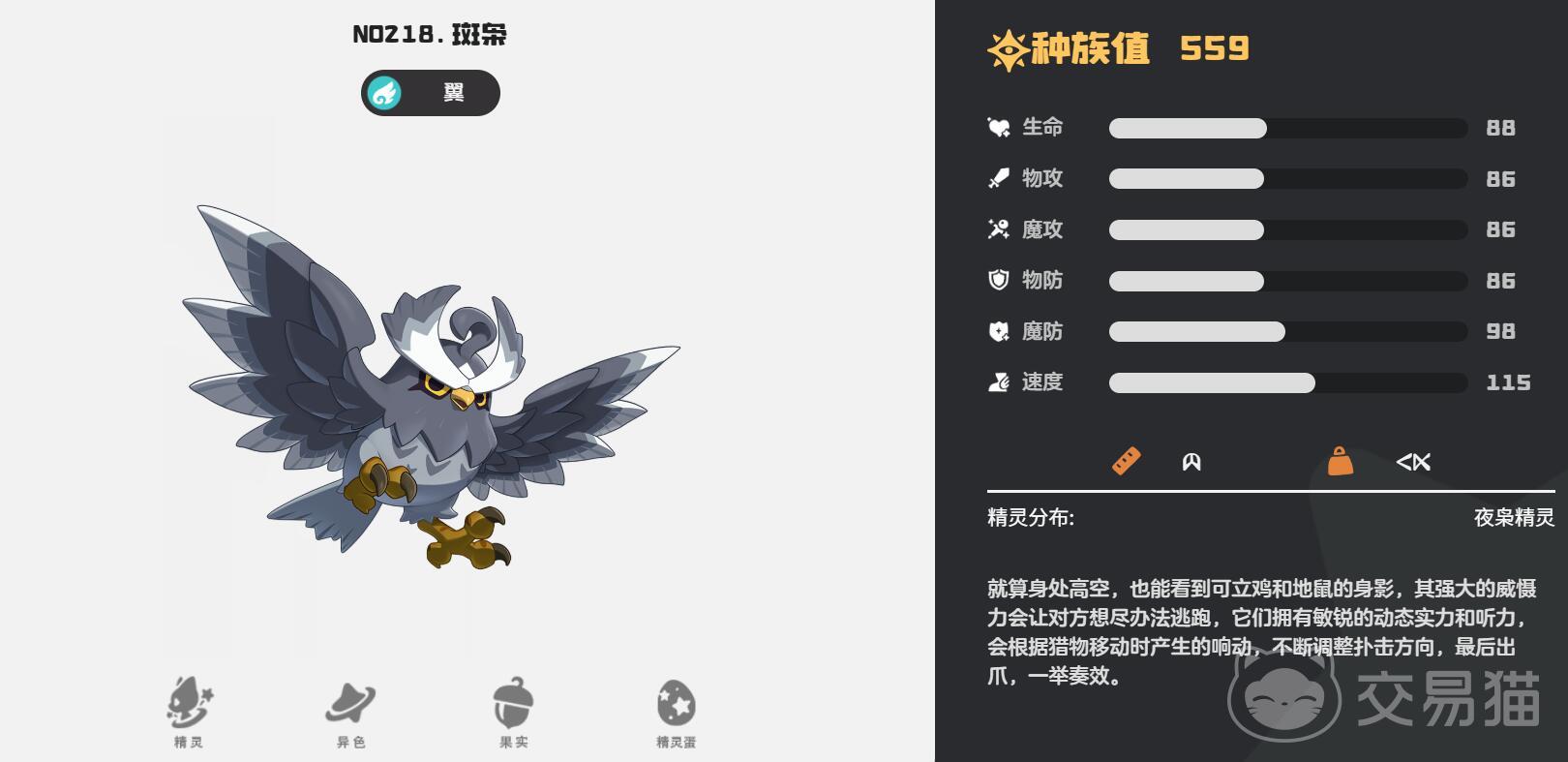 斑枭的核心技能包括旋风突袭(翼系物理,威力90,先手+1)、暴风之翼(范围伤害+概率提速)、致命俯冲(高暴击单体攻击)。推荐搭配疾风守护(提升闪避率)增强生存,若需强化输出可替换为破甲利爪(无视20%防御)。特性掠空者在击败目标后提升15%速度,需通过连击机制联动触发。但是其特质非常鸡肋,名为逐魂鸟,是针对幽灵系精灵,能造成双倍伤害。