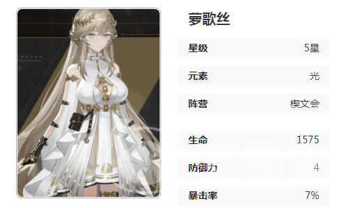 萝歌丝:是一个近战输出女王,普通攻击可以直接给敌人造成附加状态,而且还会有一个叠加效果。大招和武器有直接的关系,如果在释放时,队伍中成员的生命值全部在80%以上,就可以有效提升10%的全队伤害。