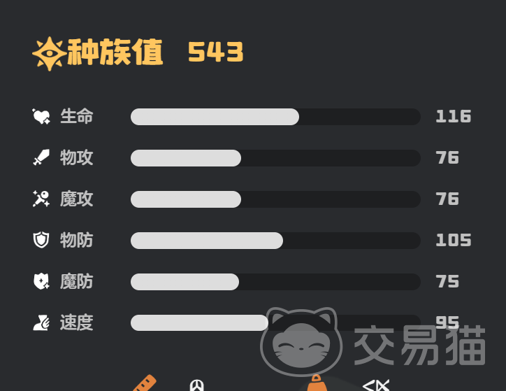 巨灵石作为地系精灵的一种,它的防御能力和生命力是十分出色的,生命力116、物攻和魔攻均为75、物防105、魔防75、速度95,从各个属性值不难发现它的速度比较慢,而物攻和魔攻非常的均衡,为此我们在选择技能时就需要考虑是走魔法攻击的路线,还是走物理攻击的路线。