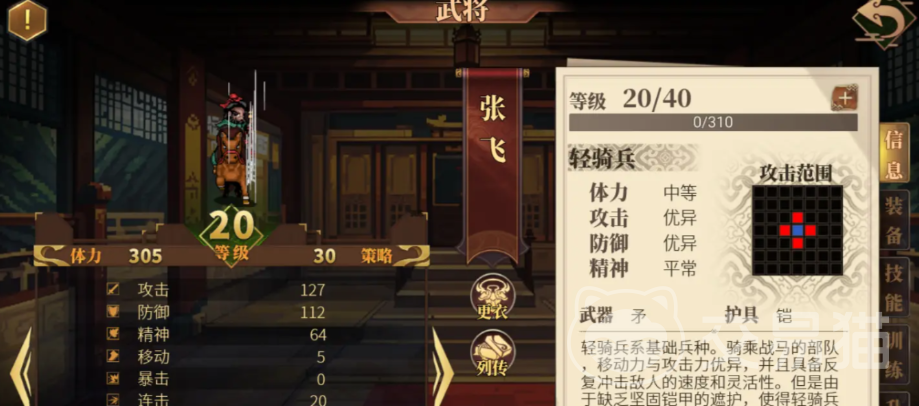 桃园三结义中的张飞也是一员猛将,不过建安外史中的张飞更偏向于近战肉盾型英雄,那他在升迁时选择的方向最好就是重骑兵,重骑兵这个职业可以让张飞的生存能力以及防御力得到不同程度的提升,让他在战场抗伤害时变得更肉,给他选择装备的话,不要带刀、剑这类,最好带盾牌类的武器,这类武器能增强他的格挡几率,让格挡效果变得更好。