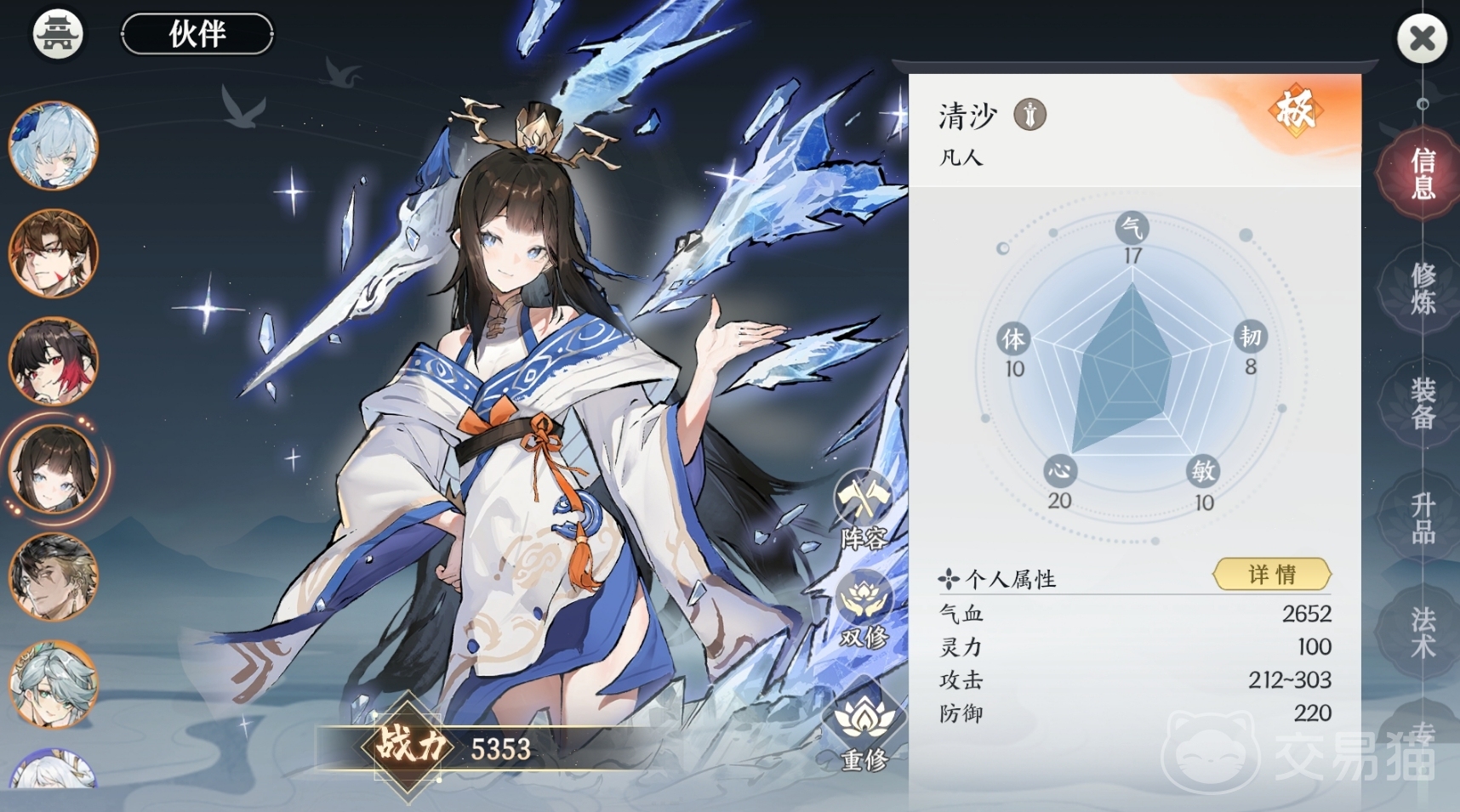 这是套伤害非常高的伙伴搭配方案,其中南宫婉儿和惊尘都有非常强大的AOE能力,武技也自带无视防御,所以在任何场合都能打出很不错的输出,配合上清玉的加速冷却特性,令整套阵容的输出节奏非常丝滑,而且他们抽到就能用,零星的效果也很好。