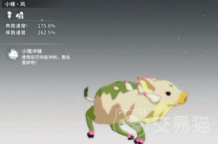 还会有等级更高的小猪闪闪,其实就是整体散发着金光,并且有着黄金质感的一只猪,奔跑速度会比普通的小猪更快一些,但是还是不如其他的坐骑,小猪风也是小猪的一个类型,奔跑速度也并没有那么快,但是这个小猪的造型奇特,会有白,绿,黄粉四种颜色搭配,可以使用的技能也是小猪冲锋。