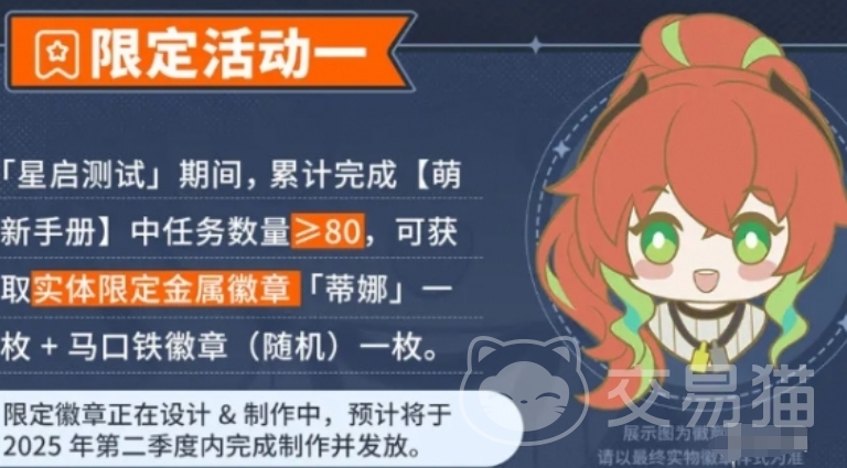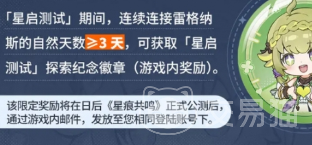 在星启测试期间,玩家如果累计完成萌新手册中任务数量大于80,就能获得一枚实体限定金属徽章蒂娜以及一枚随机的马口铁徽章,参与限定活动可获得探索纪念徽章,测试结束后,项目组会依据测试结束时的服务器数据进行统计,在10个工作日内通过公告公布获奖名单,后续领奖方式也会一同公布,在星启测试期间,只要玩家连续连接雷格纳斯的自然天数大于3天,就可以获得星启测试探索纪念徽章。