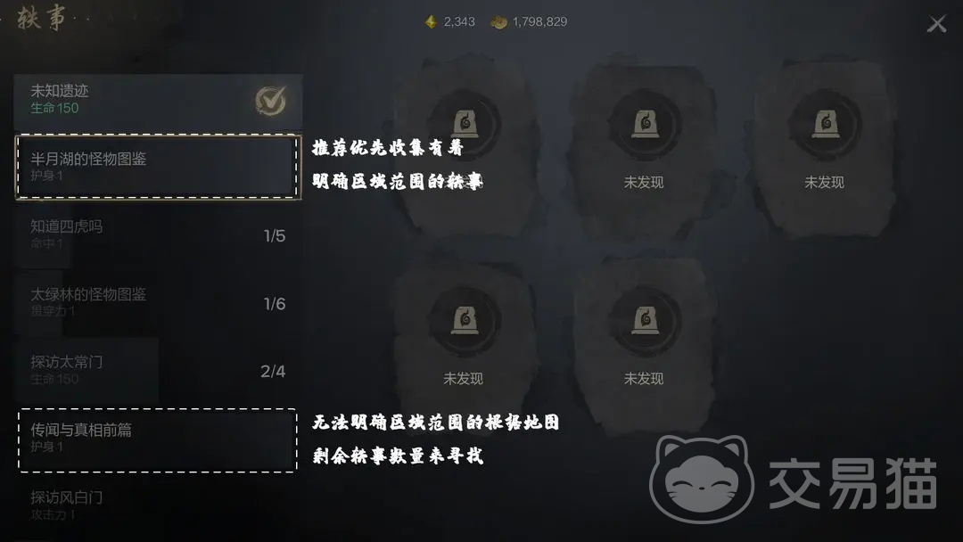 虽然没有被发现的不会显示在地图上距离的位置,但是每个区域获得总轶事是能看到的,这样就能避免地图上已经发现了,但自己还在寻找。轶事的收集一方面能更深入的了解世界观的设定,另外就是对角色提供增益。