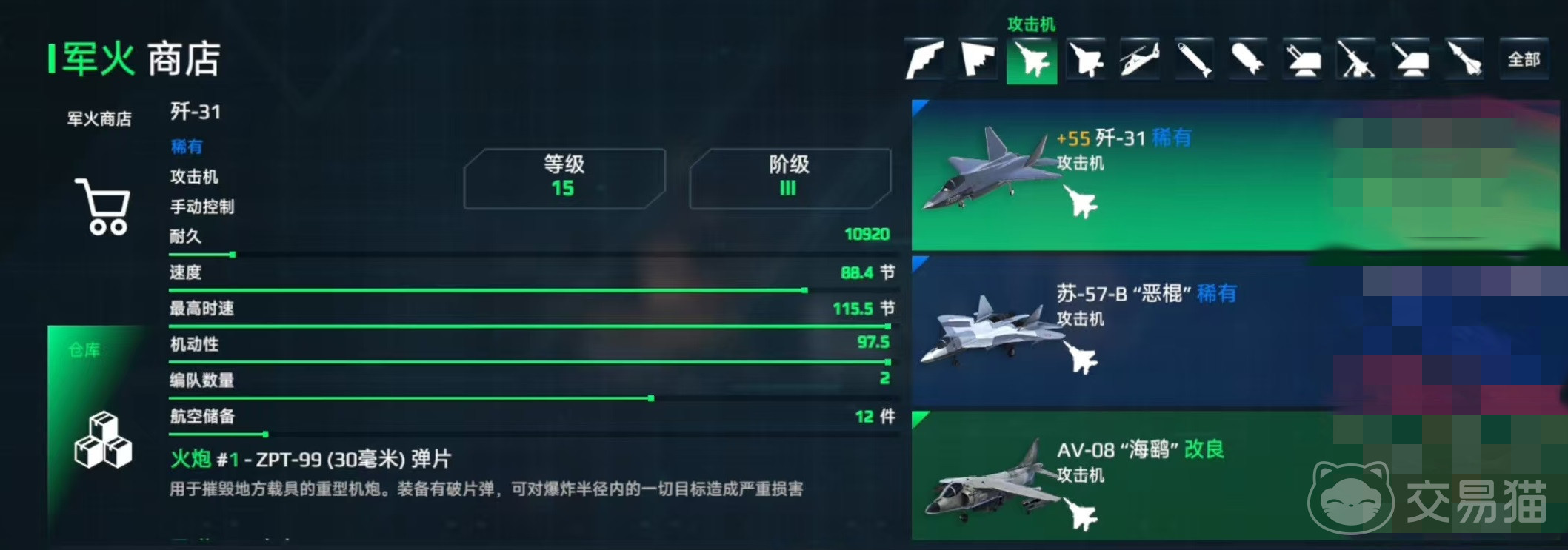 歼31是游戏中性能非常出色的三级攻击机,它是一款有隐身能力的攻击机,这样的能力并不是噱头,而是能够更好的隐藏自己。可以降低被敌方防空火力发现和拦截的距离,这样能够更快速地接近敌方目标,提高攻击的成功率。毕竟没有隐身能力的战机,例如歼15等,很远距离就会被敌方发现,而歼31就可以快速突破对方防空。