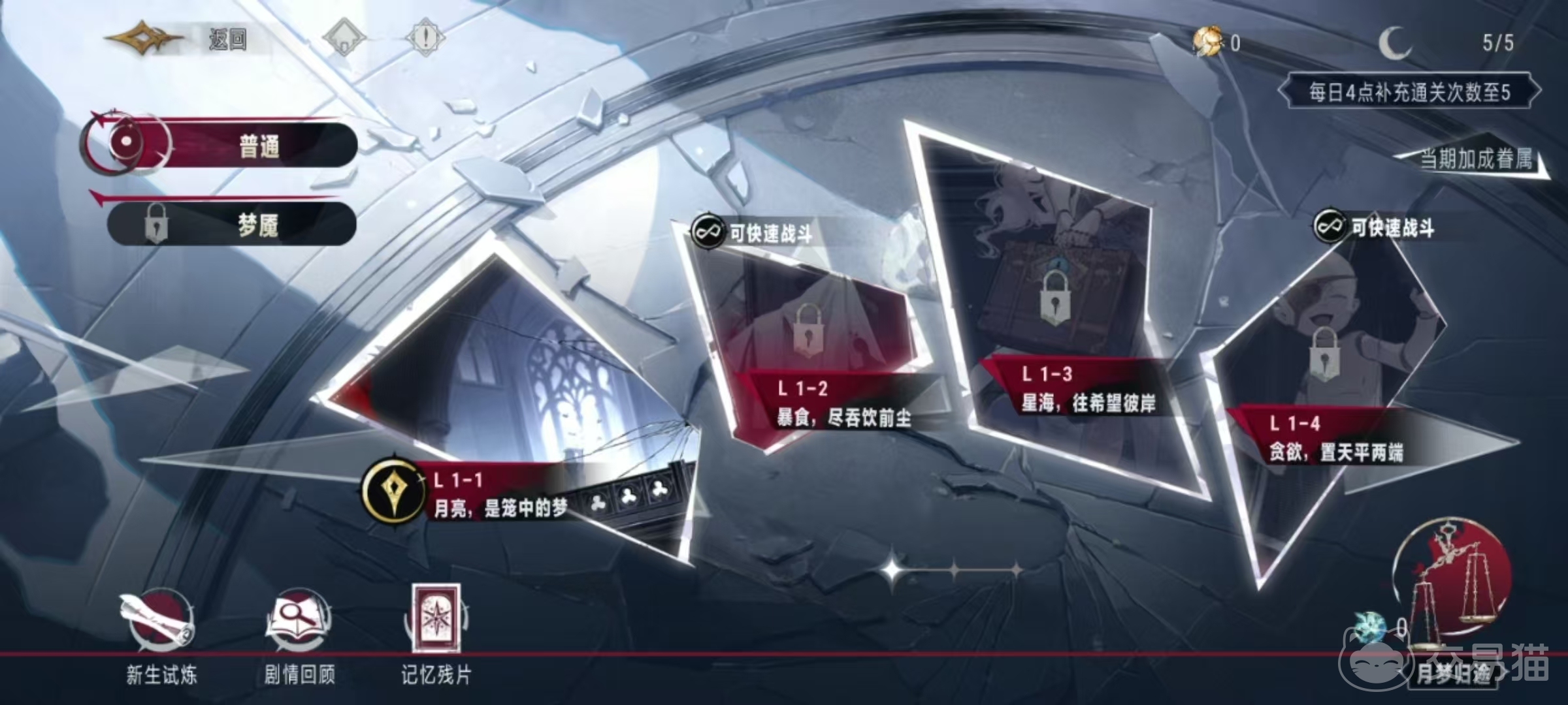 梦魇模式在活动开启之时并不是同步开启,而是需要开启一段时间后才能开放,而且需要通关普通模式后才能体验到。活动关卡战斗需要消耗通关次数,每天4点补充通关次数,最多为5次。大家也可以在限时活动商店月梦归途中购买通关门票星红脐带。这个活动是有加成眷属的,使用这些眷属,可以提高额外奖励获取几率。当概率达到100%时,必定会掉落额外奖励部分。活动关卡是可以重复挑战的,关卡首次通关后,能够使用扫荡功能,通过消耗通关次数或者是通关门票来获得该关卡的奖励。