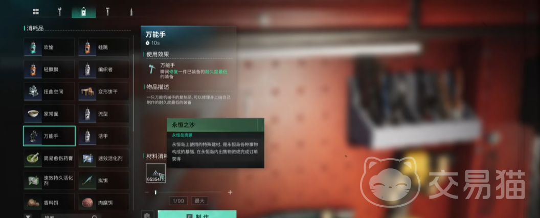 配方一般是通过游戏里的任务,探索,以及交易之类的方式去解锁的,这时候就能开始维修武器了,配方解锁之后,就能看到“匠师之手”生成的制作万能手所需消耗的材料,其中永恒之沙就是关键的资源,材料准备好后,就能在工作台上将万能手制作出来。