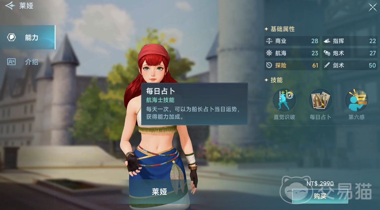 莱娅是探险值很高的航海士,在解锁了第二个技能占卜后,她每天都能通过占卜来为船队提供加成,等同于让各位每天都能获得一个buff,非常的实用。
