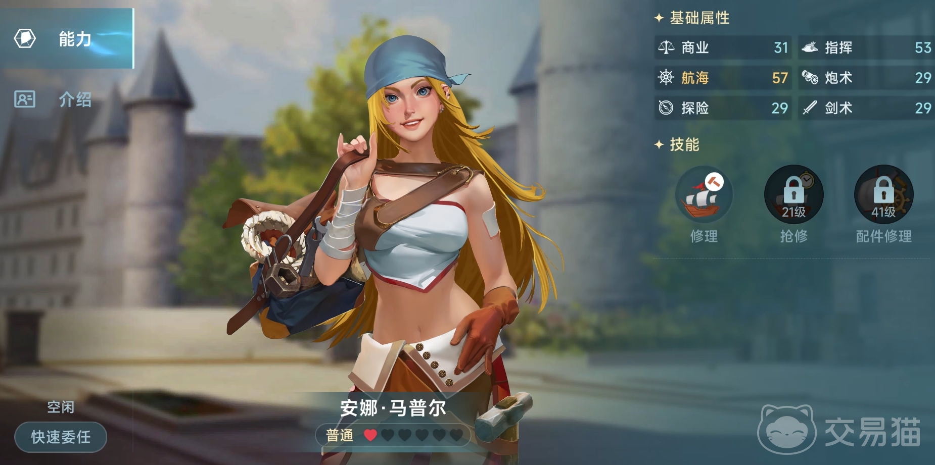 主线会送的一名航海士,海航值非常高,是副舰的绝佳人选,其所带来的修理、抢修能力都是航行时很好用的技能,光靠她一人就能帮助玩家度过开荒期。