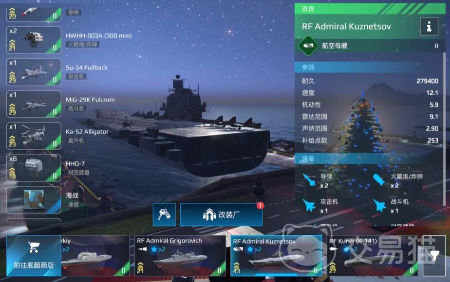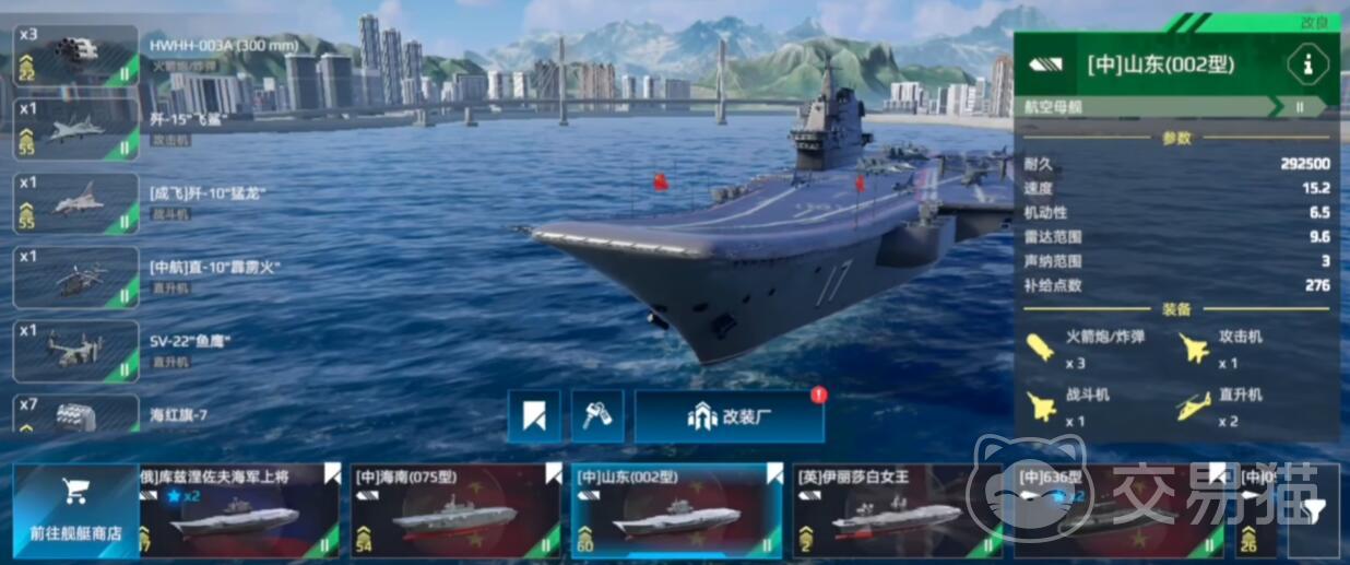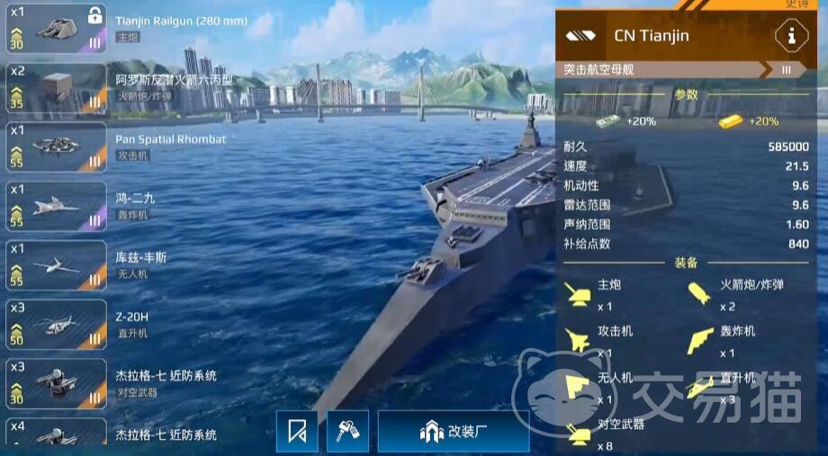 天津号通过转盘活动获取,主打火箭炮与无人机群压制。配备4座火箭炮和2架攻击无人机,近距离爆发极高,适合清理敌方潜艇或脆皮驱逐舰。舰载机选择AV8B(反潜+空战)弥补防空短板。操作时需预判敌方走位封堵路线,并频繁利用掩体规避伤害。生存能力较弱是其最大缺点,而且是氪金船,需要大家最好掌握航母玩法之后进行进阶。