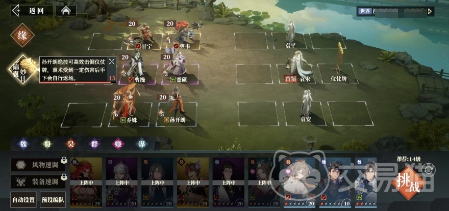 毕竟袁术是这一关卡的关键核心目标,只要能够对他造成足够的血量伤害,就能够顺利达成过关条件,不过这种思路对玩家的队伍要求极高,要求玩家的卡牌等级必须达到一定层次,技能等级也要足够高,而且整个阵容的实力搭配要十分合理且强大,只有这样才有可能在有限的5回合内对袁术形成打击,从而一举过关。