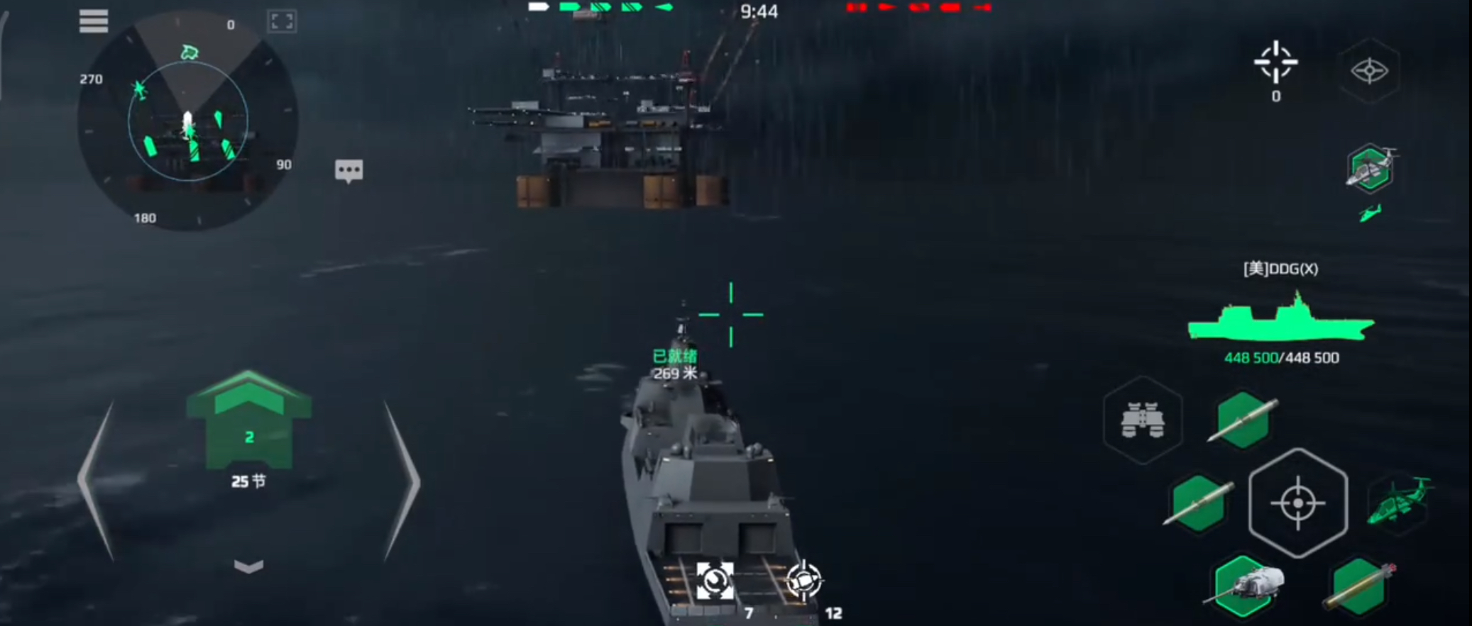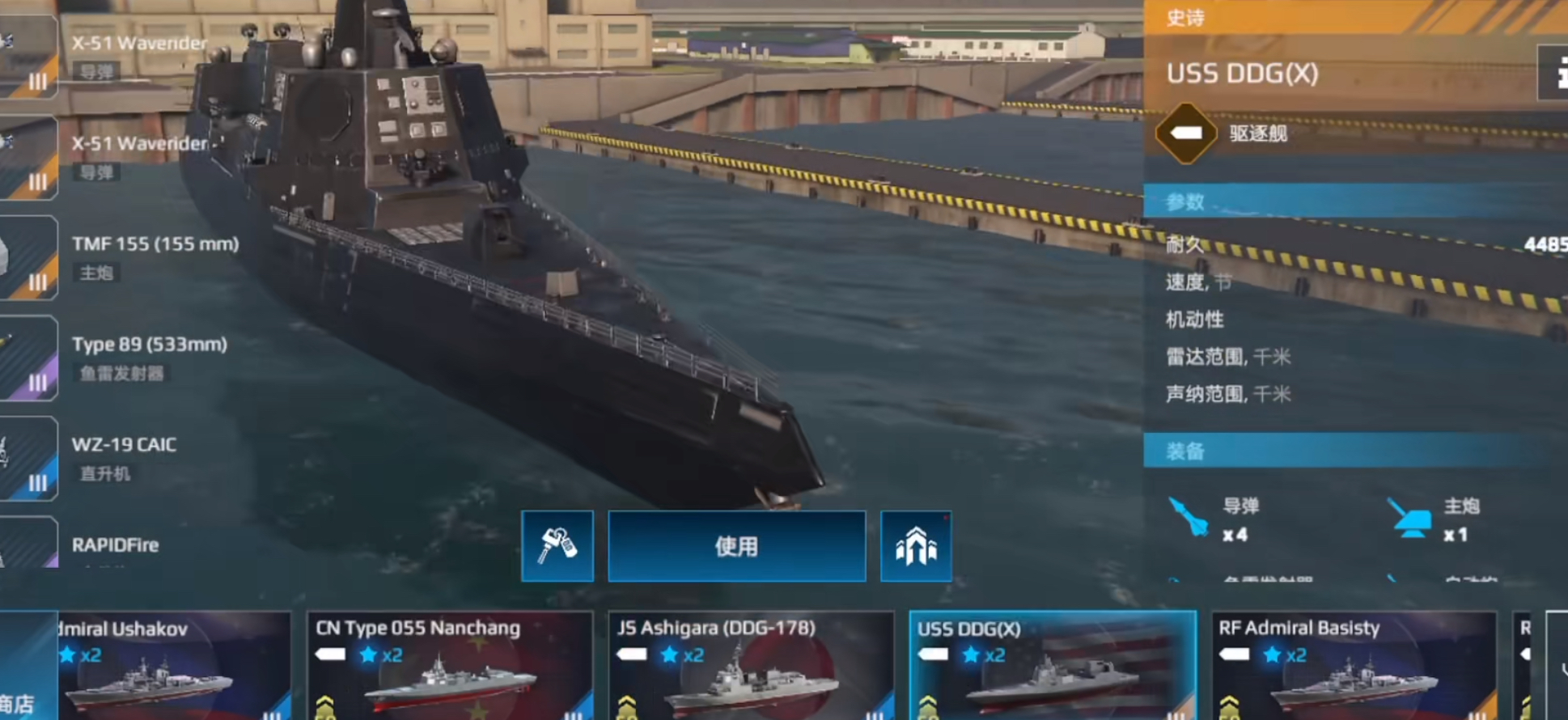 首先简单了解一下ddgx驱逐舰,是属于上线比较早的一款美金驱逐舰,并且还有自己的专属皮肤,在颜值方面是狠狠拿捏住了。ddgx搭配了1×1加1×3的四座导弹槽位,一座主炮,两枚鱼雷,两座自卫炮,2×1加3×1的五座防空系统以及一架直升机,在火力方面可以说是非常凶悍了。满属性状态下的ddhx达到了448500的耐力值,速度为9.8节,雷达范围8.8千米,探测范围4千米,声纳范围2千米,从火力配置和属性方面来看,ddgx的强度是非常不错的,是比较推荐入手的。