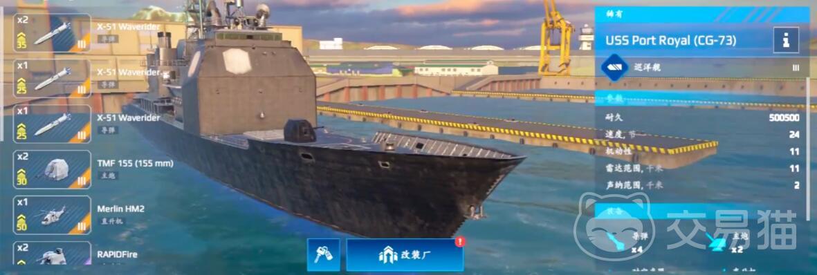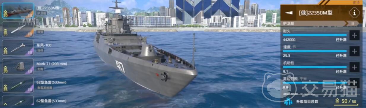 高机动突袭型:俄系22350型护卫舰适合游击打法,航速快、转向灵活,能快速穿插战场。航速35节+隐身涂装,主武器带鱼叉导弹打爆发,副炮用密集阵防身。这套配置专克慢速船,但遇到航母容易暴毙,而且主炮也差点意思,记得多找掩体卡视野。