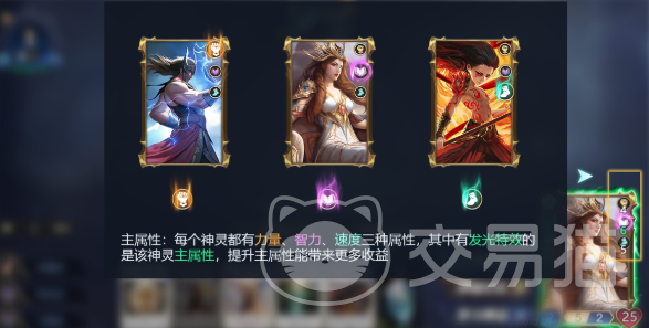 游戏中这些神灵会拥有力量,智慧,速度这三种基础的属性值,大家在选择角色时,也可以着重注意一下他们独特的主属性,会有一个醒目的发光特效,为大家显示帮助玩家们更好的来识别与了解,这种主属性也是非常重要的,后续也会获得相应的属性增益的技能。