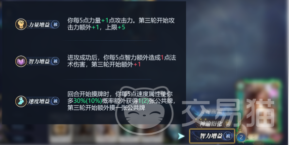 每一种属性增益的方向也是不一样的,如果大家是力量增益,就可以提升攻击的能力,如果是智慧增益,就可以来提升法术的输出,如果是速度增益,是可以来摸取更多的卡牌,这些属性增益的效果都会进一步的得到强化。大概在第三个回合就可以进行游戏的整体节奏,也会不断的加快。
