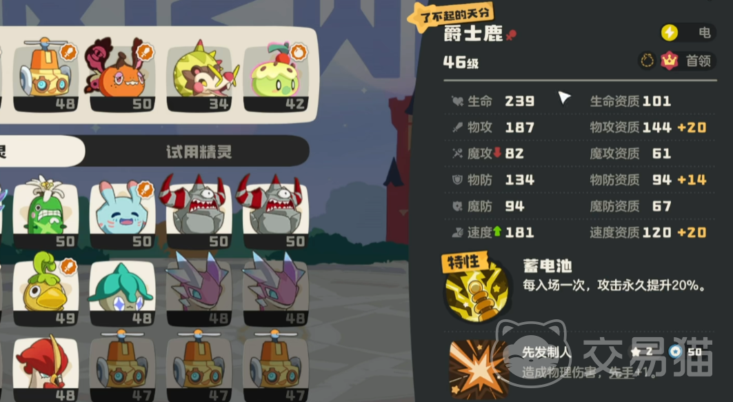 先来看看爵士鹿的特性,效果是每入场一次攻击永久提升20%。因为这个特性的存在,培养爵士鹿一定要慢速度资质,不满速是玩不了电鹿的,只有这样才能最大化特性收益。