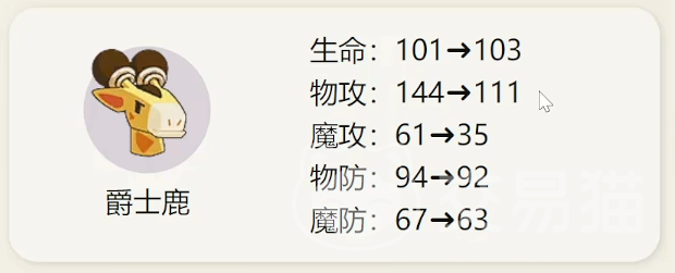 核心属性中物攻从144降低到了111,首领话的爵士鹿物攻则从159降低到了117,这波削弱还是挺严重的,需要叠多次被动才能抵消这个基础数值调整,不过倒也不是到了不能用的地步。