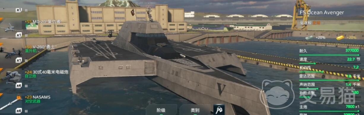 海洋复仇者有两个无人机槽,必带X-47B(单轮伤害9.6万)和RAH-66直升机(反潜+侦查)。主武器用特塞奥MK2/E导弹(射程12公里,贴脸伤害1.8万),主炮选OCAV-120速射炮(射速快,辅助防空)。防空带NASAMS(拦截导弹)和千禧年近防炮(防飞机)。重点升导弹和无人机,主炮蓝色品质够用,反潜靠直升机标记位置后用火箭弹清场。
