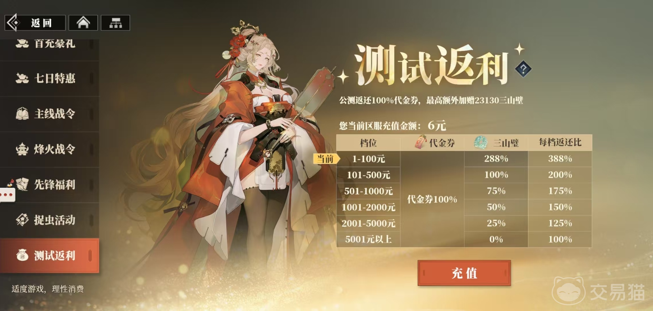 游戏真正秉承了三幻一贯的无废将游戏理念,所有角色都可以提升至SSR,不会有属性数值方面的差异。所以大家千万不要因为初始武将品级比较低而放到一旁,很多看似低级的武将,培养起来之后却可以有很强的效果。每个武将还有着多个方向可以进行转职,每个职业都能够为战斗带来决定性的帮助,通过合理的进行阵容搭配和武将职业选择,能实现越战力挑战各个关卡。本次测试在福利方面也非常丰厚,首先是测试过程中的充值返利,只要在本次测试中进行充值,公测时就会100%的返还代金券。代金券同样可以直接抵扣消费。还能按照不同的充值档位额外返还三山壁,也就是说在测试中充的越多,公测时优势也就越大。
