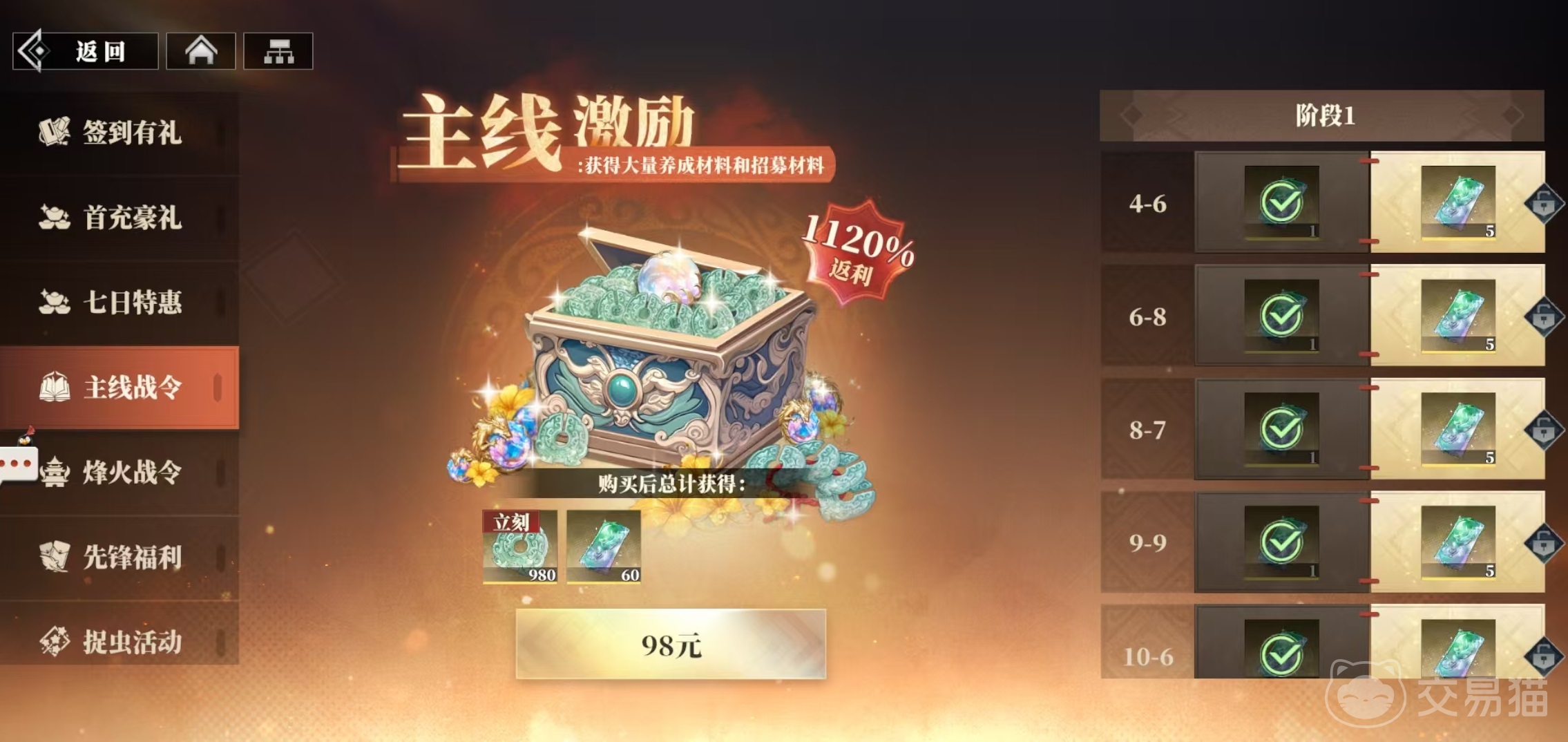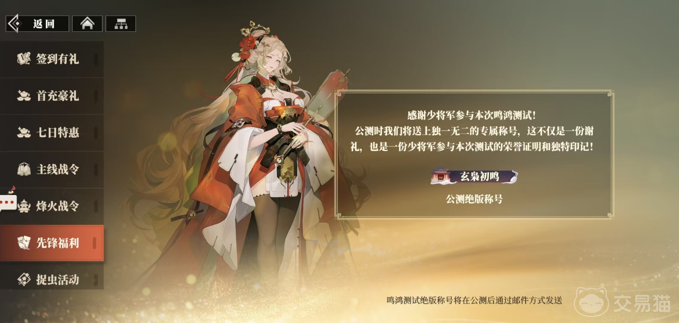 接下来就是开服之后的常规福利活动,通过每天签到赠送大量道具奖励,包括强势的武将和游戏内货币等,还有首充豪礼、7日特惠、主线战令、烽火战令等。这几个战令小编是强烈推荐大家去激活,因为达到每个阶段,都可以额外领取很多道具,帮助大家在抽卡方面领先一步。其他活动还有包括全民无双、十日活动等,这些都有的大量奖励赠送。最后另外凡是参与测试的玩家,都可以获得一个独特称号,这是属于测试玩家独一无二的专属称号。