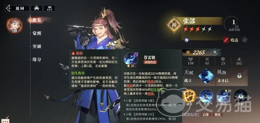 需要特别注意的是战场上的链接效果并非无限叠加,最多只能存在一条链接,且这条链接一旦形成,便无法被任何手段驱散,这种机制不仅增加了战斗的复杂性和策略性,也让张郃的每一次攻击都充满了变数与可能,而张郃这里大家就可以尝试用关羽来作为主要输出,然后加成赵云、刘备、张飞及蹇硕的阵容。