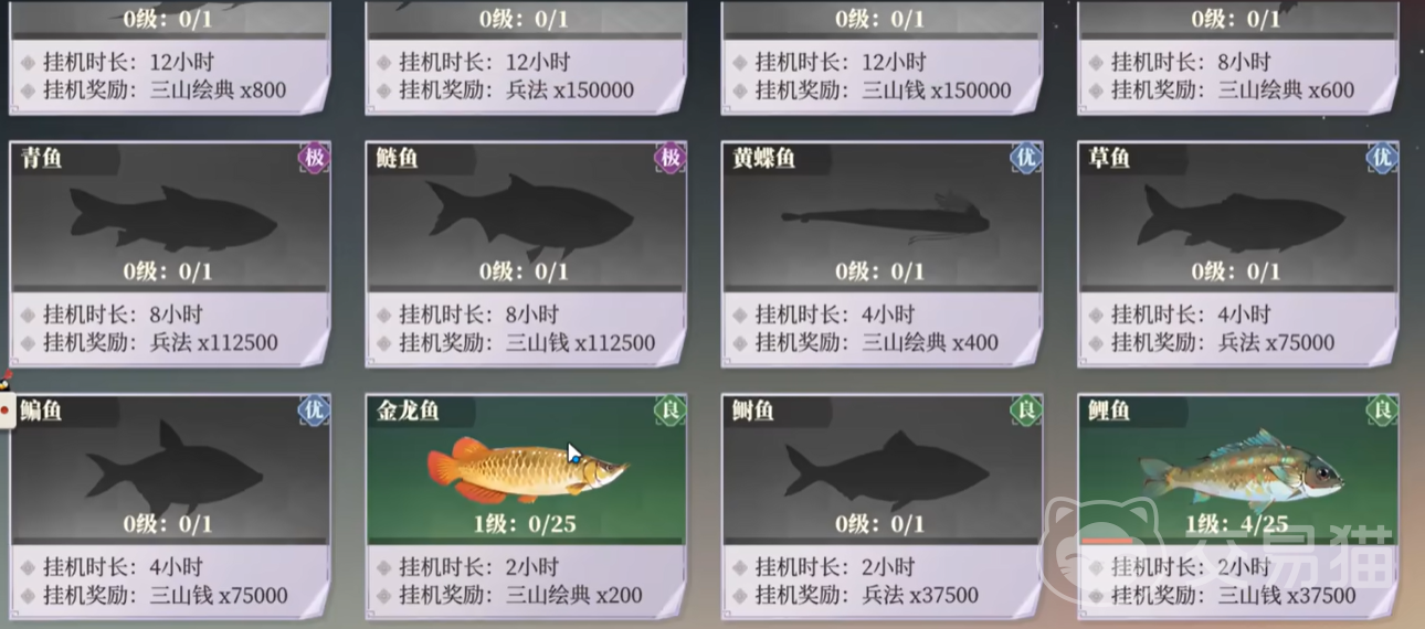 玩家所钓到的鱼类品质基本上以绿色为主,所提供的经验不算太高,时长基本上是2到4个小时左右,不过随着后续家园的提升,玩家们是可以开始钓到极品的鱼类,或者通过活动以及主线副本进行获取,这类鱼的挂机时长都是8小时,而且经验较为丰富。