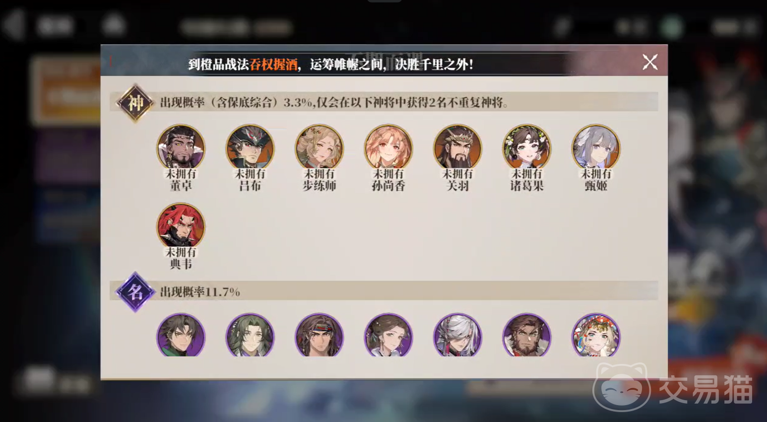 接着再来讲一下卡池的保底规则,在这个卡池中,大家100%可以获得至少两位不重复的神将。但是单次抽到的概率则是3.3%,所以概率挺高。即便你所获得的天机令不够多,也可以勇敢尝试。也就是说大家只要抽40次,就必定可以获得1个神级角色,两个的话就要80抽。