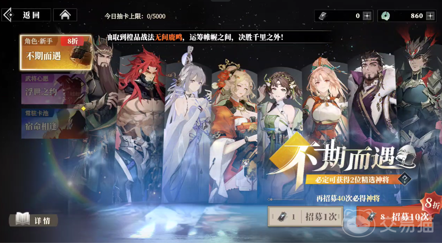 如果大家对该游戏的新手卡池感兴趣,就可以前往不期而遇抽卡。那么三国志幻想大陆2枭之歌不期而遇怎么样?其实这个卡池的性价比也很高,因为8折就可以连续抽取十次。也就是说只要32抽就必定可以获得一个神级武将,非常划算。