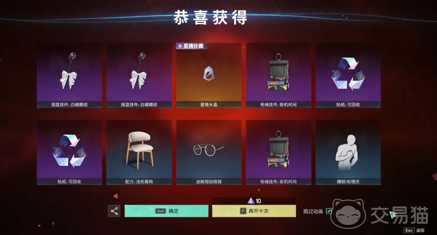 如果大家想要的话,可以直接抽取10次。那就有一定的概率获得不同品质的装扮道具或者一些特殊表情,另外还可以获得星铸水晶。这种东西可以在商店中兑换你想要的物品,要是某些道具已经拥有的话,那就会作为星铸余光回收,星铸余光可以升级成为星铸水晶,同样值得大家获取。