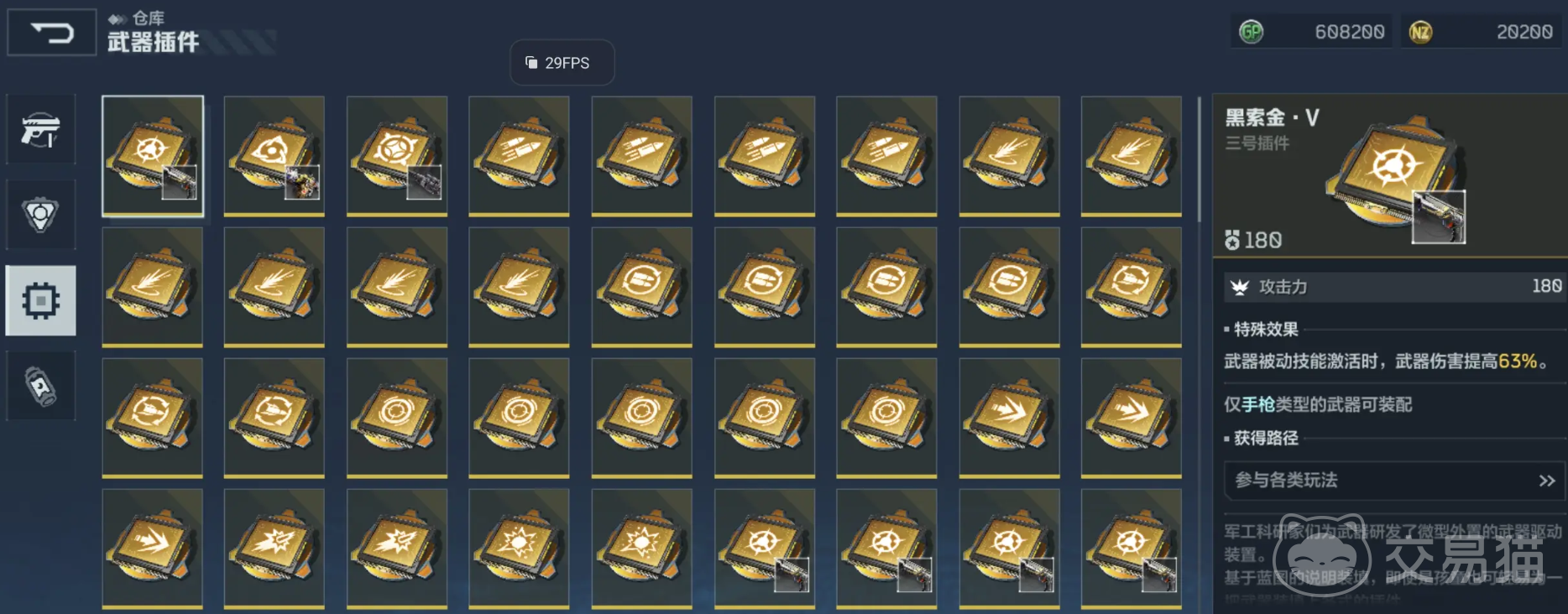 接着再往下看的话就是武器插件,这种东西就是直接插在武器上面的道具,然后就可以为你的武器带来特殊效果或者属性加成。至于最后一种的话就是道具,道具的分类非常多。就相当于杂货,例如金币或者其他好用的箱子。