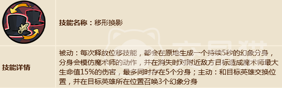 先来看一下魔术师这个角色的主要技能特点,它的被动技能是在每次释放位移技能后,会在原地生成一个分身,分身持续5秒钟。在持续时间之内,分身会模仿自身动作,消失时能对附近敌人造成一次输出。这个技能达到三星时,输出是魔术师自身生命值的15%,场上最多存在5个分身。