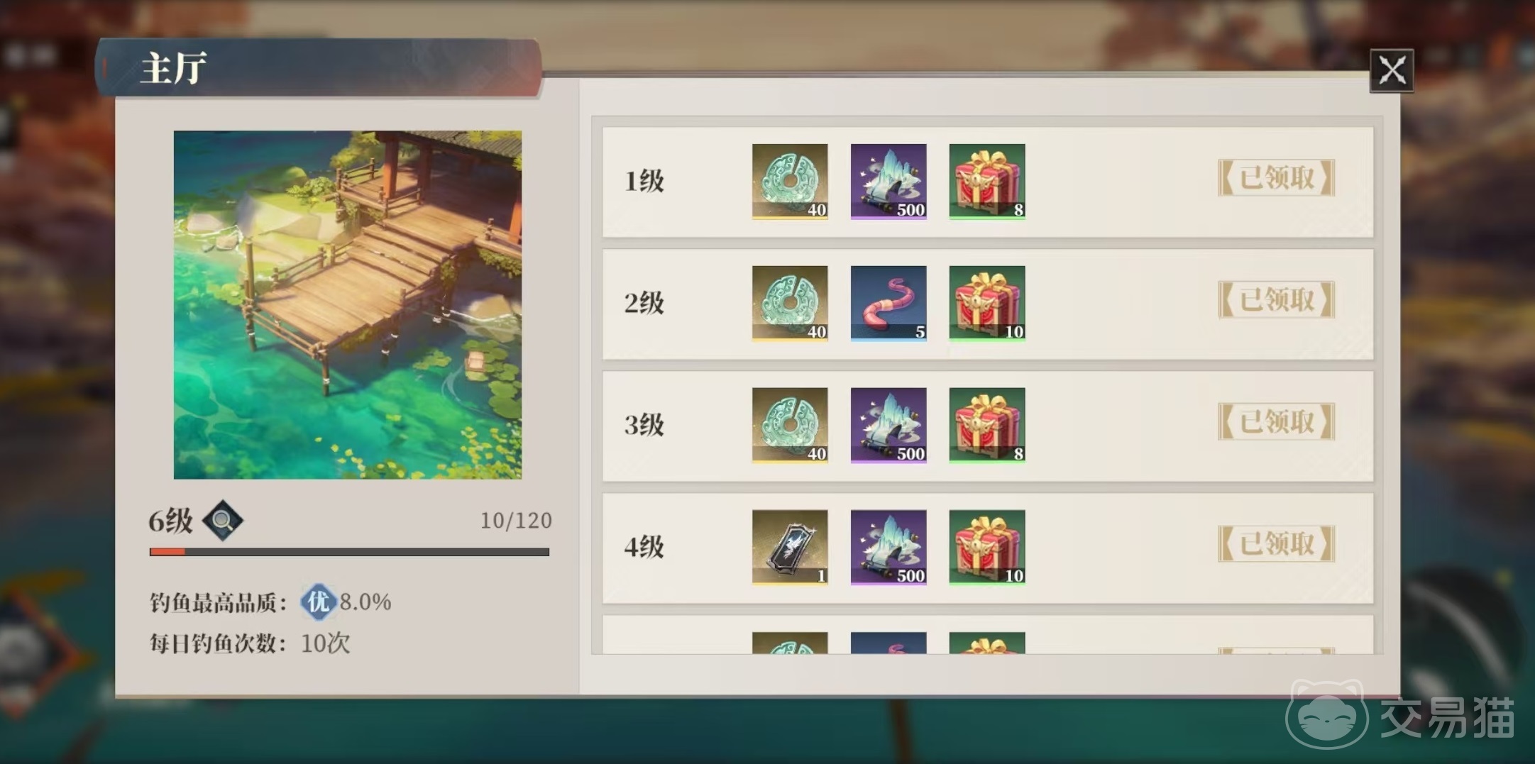 钓鱼也是有着一定的概率,钓鱼概率是和主厅的等级相关,主厅等级越高,钓到高品质鱼的几率也就越高,主厅升级之后还可以领取到等级奖励。例如在主厅一级的时候,钓到鱼的最高品质为良品,几率是16%。如果主厅可以升到最高的20级,那么钓到鱼的最高品质可以达到传说,几率为0.5%。鱼的品质越高,后续发挥的功能也就越出色。钓到的鱼主要是用于三山里中的另一项活动枭窝窝。