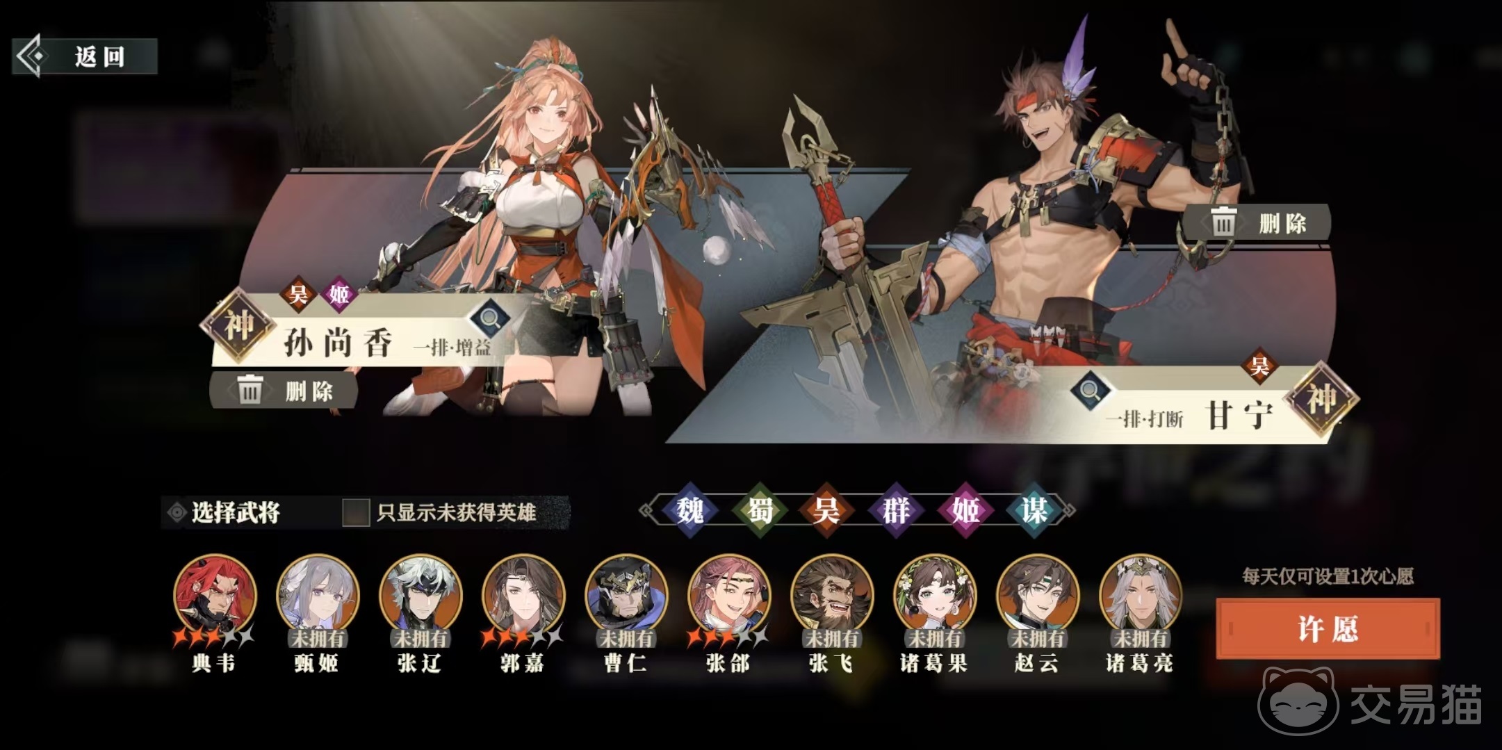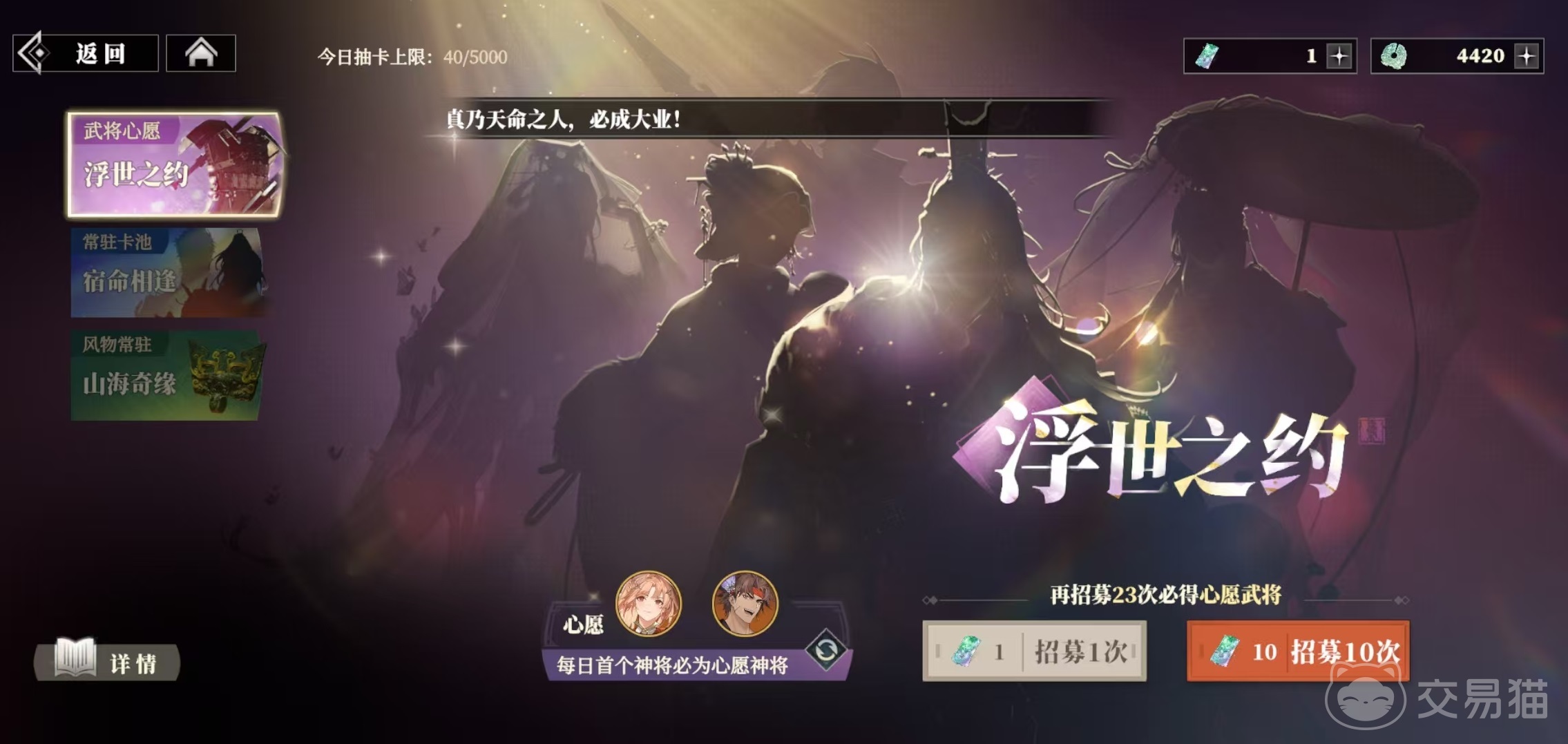 在浮世之约中可以选择自己的心愿武将,选择好之后,获得心愿的几率将会大幅度提升。这个卡池一般是用于大家在初步确定了阵容之后,就将自己核心武将设置成心愿,这将有利于快速养成核心武将。也就是可以先通过常驻池先去抽卡,然后初步确定阵容之后再去利用心愿重点培养。