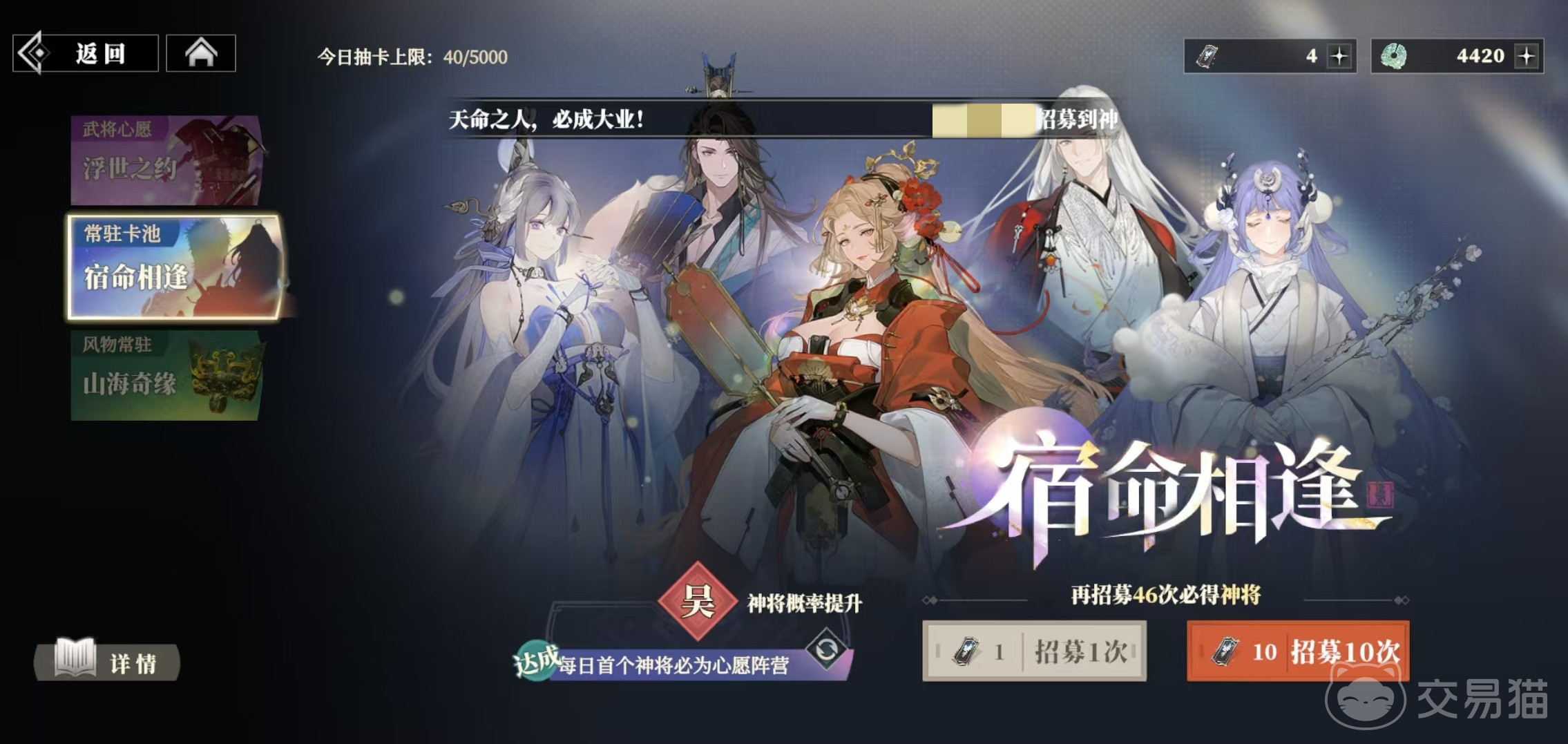 在宿命相逢卡池中,可以抽到目前游戏中绝大多数橙色武将、紫色武将和蓝色武将,每次招募会固定获得100枚三山钱以及一位武将。综合出现神将概率为3.3%,名将出现概率为11.7%,良将出现的概率是85%。每进行10次招募,必定会出现至少一位名将,每50次招募,必定会获得至少一位神将。大家在抽到一定次数之后,还可以进行心愿阵营设定。设定好之后抽取到心愿的概率会再次提升,所选阵营神降概率将提升至全部神将概率的50%,其他则不受到影响。