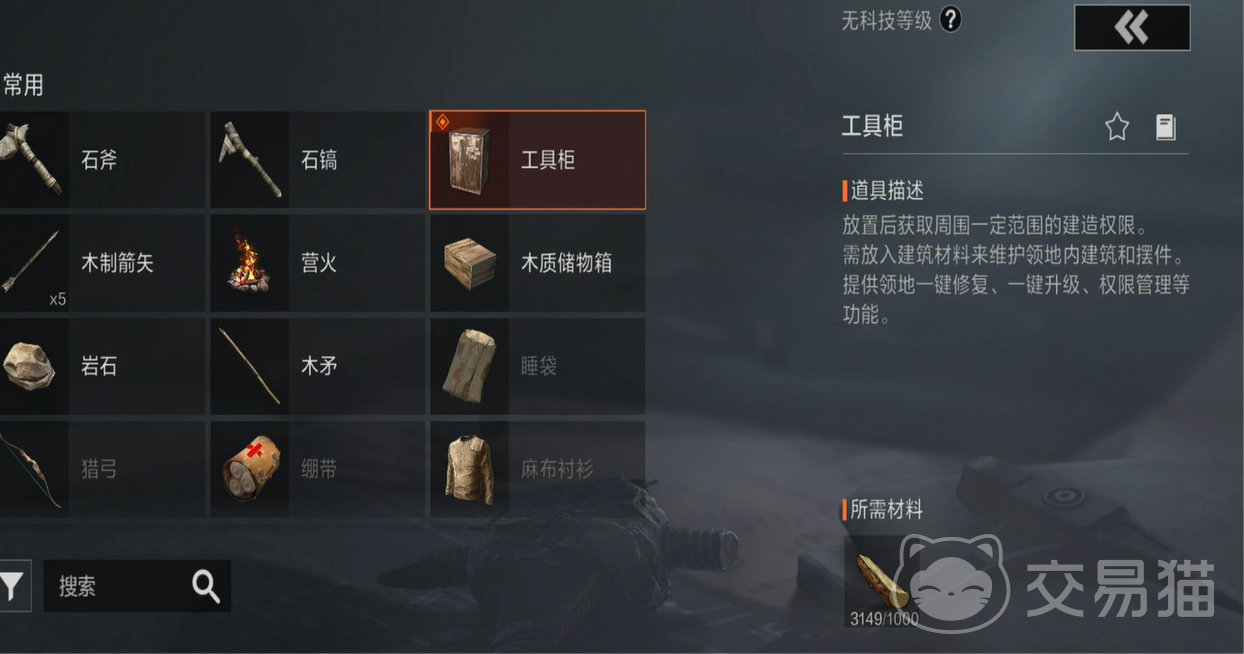 想要获得工具柜的话,大家就可以直接点击游戏主页左下角制作。其实就可以在常用里到第三个位置找到工具柜,放置之后就可以获得领地中一定的建造权限。内部的建筑以及各种摆件都需要进行维护,然后就可以将所拥有的材料放入工具柜,即可自动维护大家的领地。