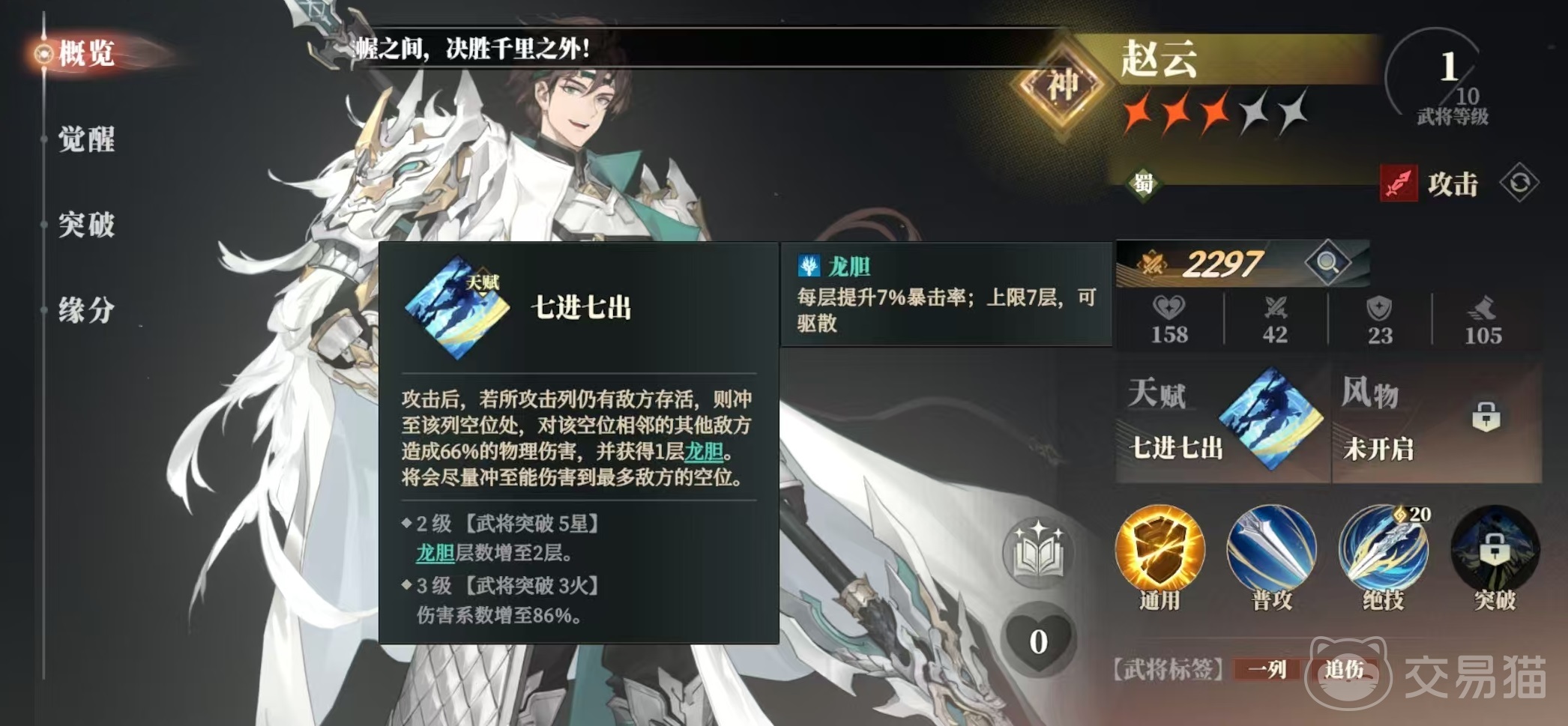 赵云的天赋是七进七出,他在攻击时,如果所选择的攻击列有敌方存活,那么直接冲到该列空位处,对空位相邻其他敌方目标造成一次物理伤害,自身获得一层龙胆。每层龙胆能够提升7%暴击率,上限叠加7层。绝技是豪龙翔空,选中敌方任意一列造成物理伤害,每拥有一层龙胆,可以提升5%的暴击伤害。在突破之后自身回合进行攻击,或者是在敌方回合承受攻击,还能额外提升自身的行动条。