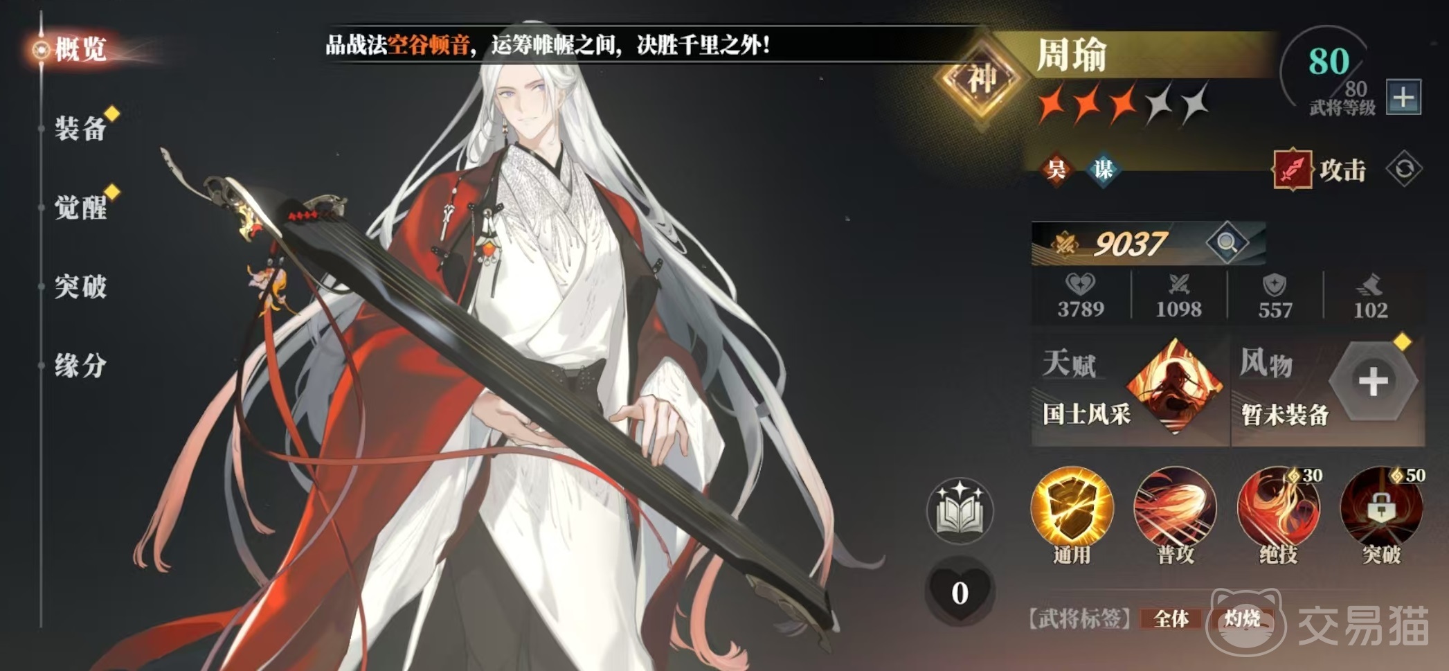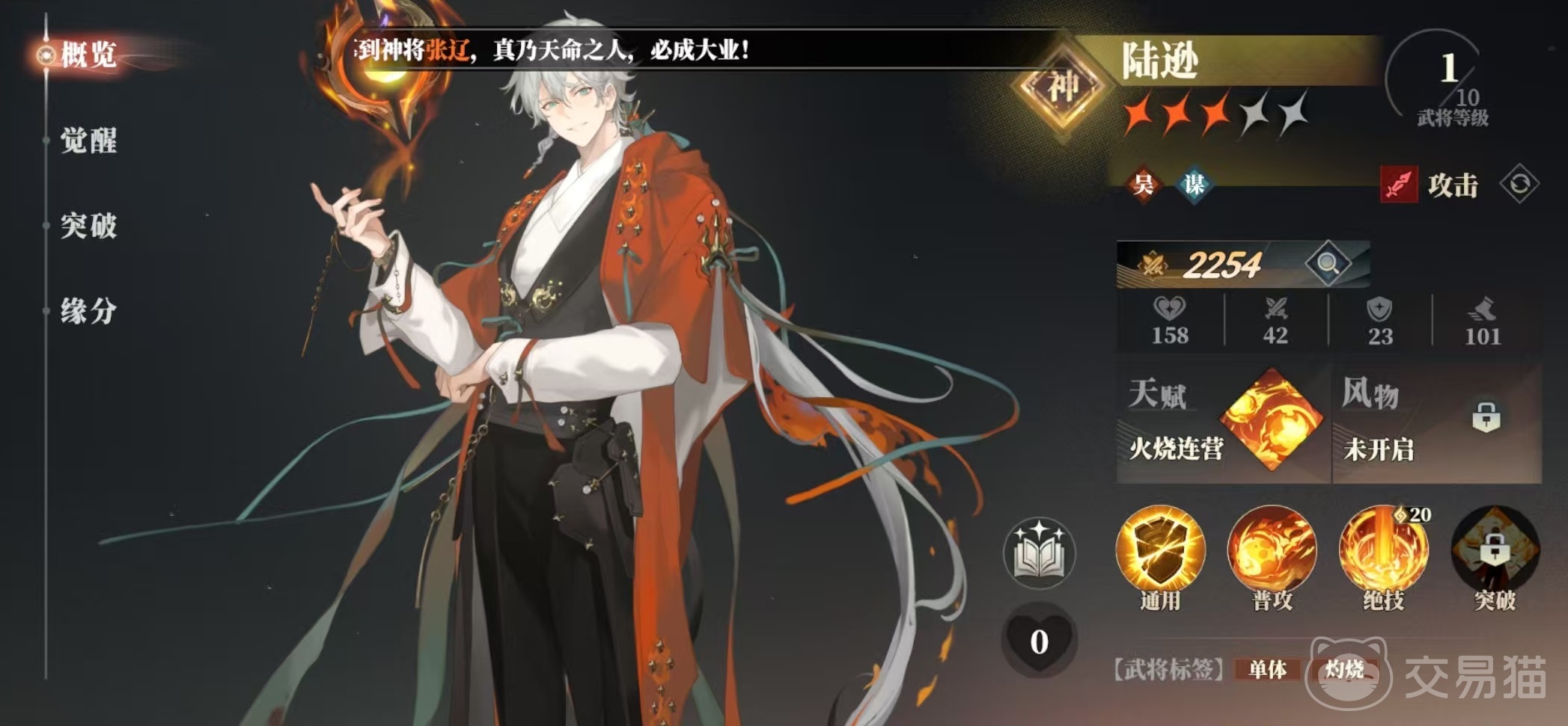 周瑜绝技能够为全体敌方目标附加灼烧,陆逊的绝技使敌方任意目标附加两层灼烧。这样配合起来,加上各自的天赋,很快就可以给敌方挂上足够多的灼烧状态。选择甘宁是因为甘宁是目前游戏开荒中的绝对神将,它的绝技带来的是整排伤害,并且对最右侧敌方还有额外暴击率加成,也是不可忽视的输出。