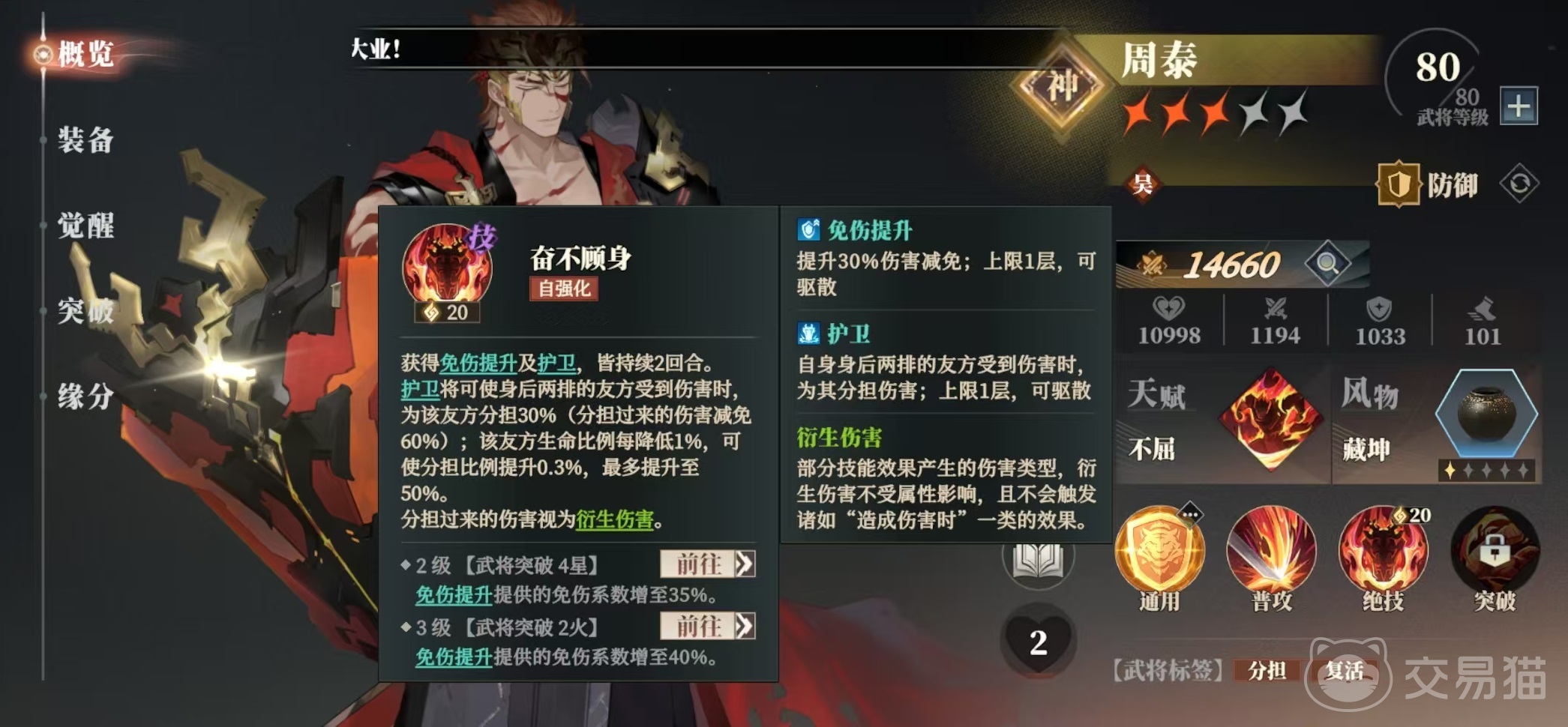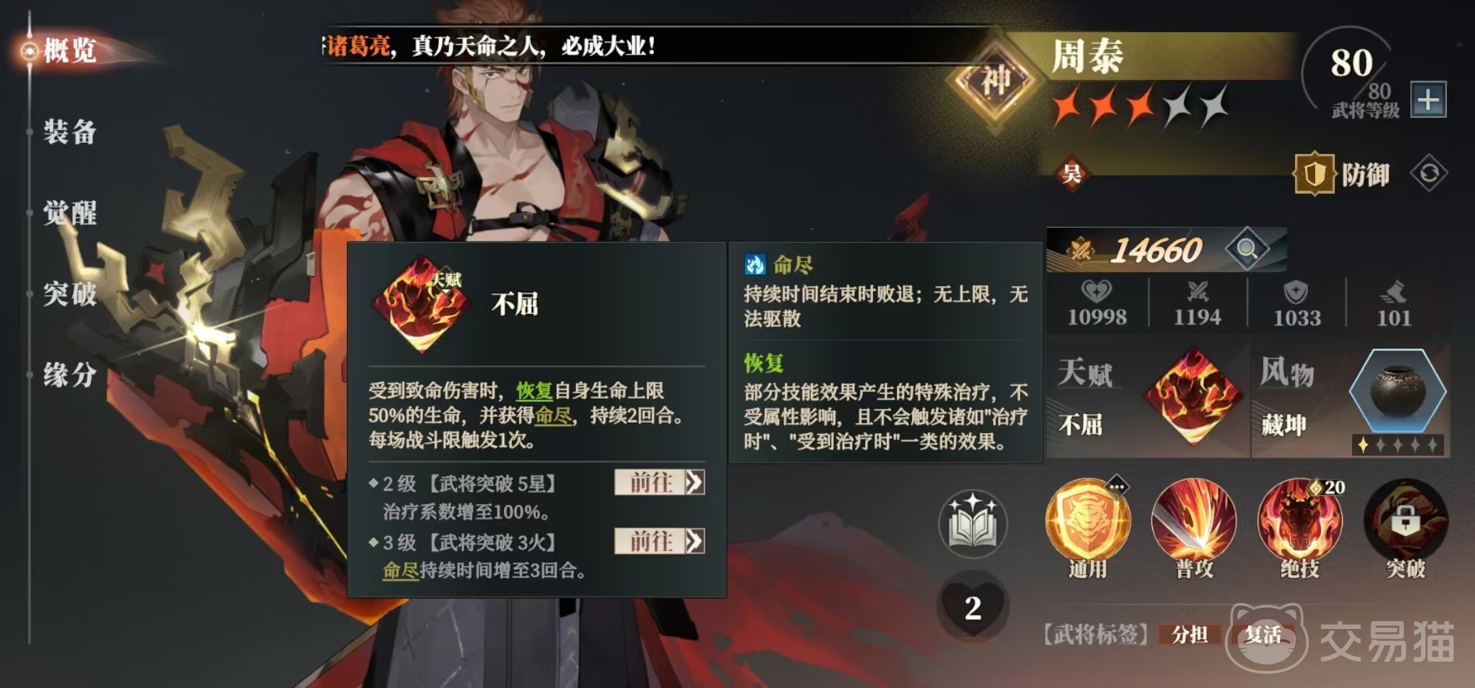 在天赋方面,周泰拥有第2条命,他只要受到一次致命伤害,就会恢复50%生命上限的血量并获得命尽效果,这个效果会持续两个回合,持续时间结束之后就会败退,也无法被驱散。虽然并不是真正意义上的复活,但多撑两个回合已经能够应付绝大多数战斗了。他的绝技更有特点,可以获得免伤提升和护卫,护卫效果是身后两排友方受到伤害时,周泰都可以为其分摊,友方生命值越低,分摊比例也就越高,这样就能很好的保护后排了。