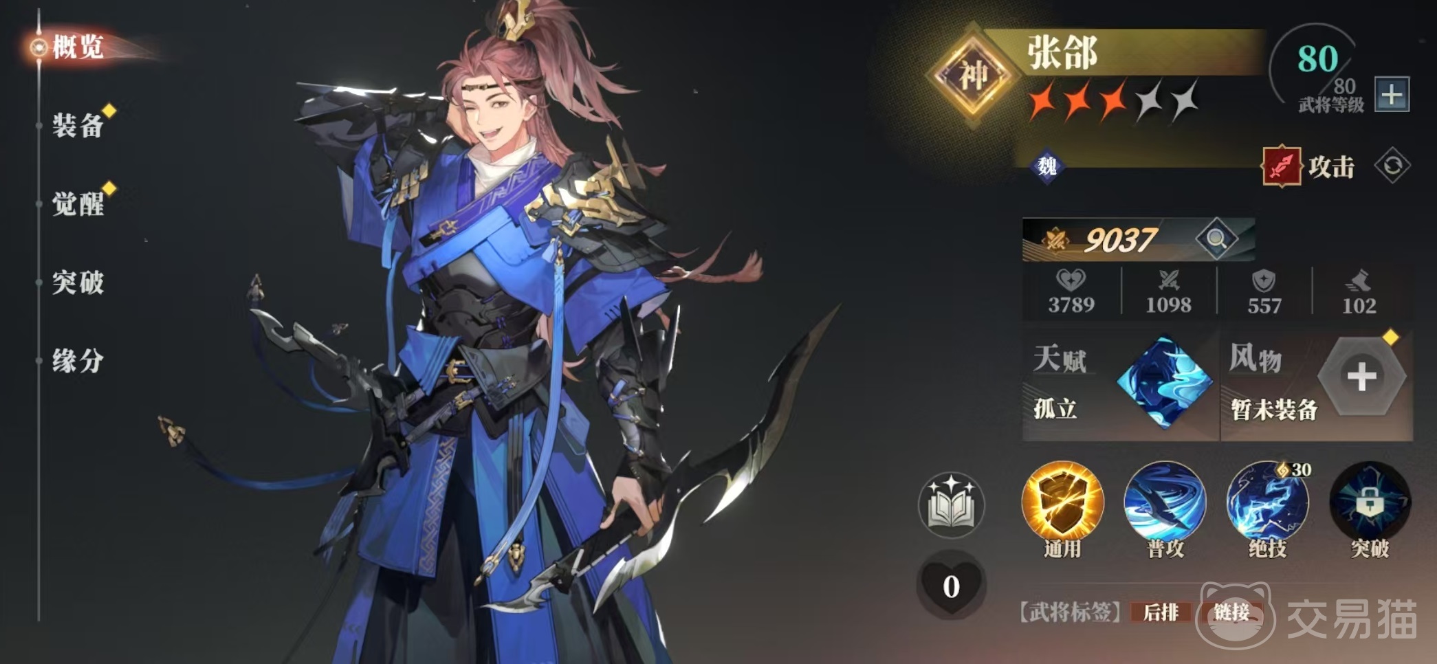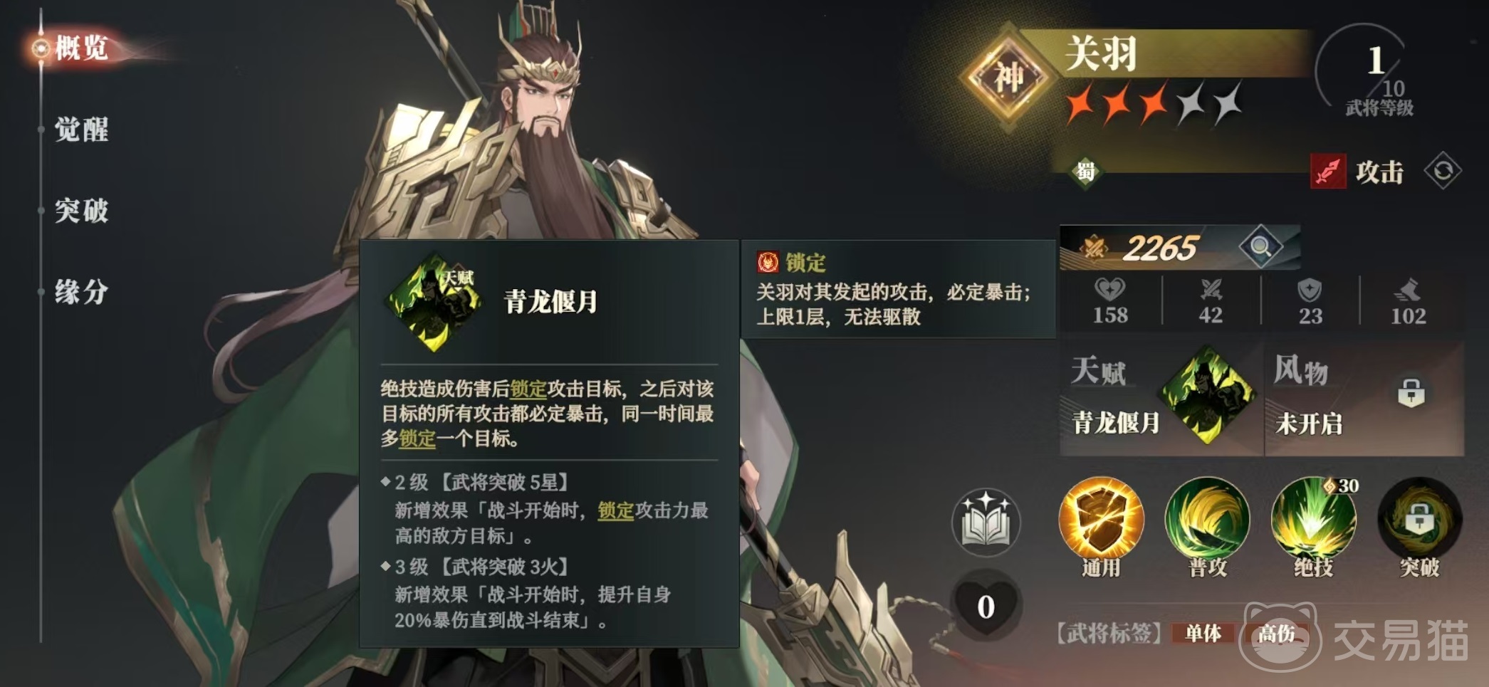 关于自身的天赋青龙偃月,使得绝技造成伤害后,直接将攻击目标锁定住,之后对该目标打出的伤害都必定触发暴击。同一时间最多锁定一个目标。自身绝技是武圣青龙击,对敌方任意目标造成高额单体物理伤害,此次攻击还有额外增伤效果,通过后续突破,伤害系数还能进一步提升。