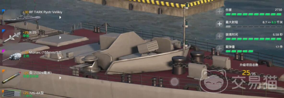 资源优先级:射速>备弹>伤害,金币优先将726-4A升至紫色品质,装填时间从4秒缩至2.8秒,备弹量提升至28发,涂装也是必备的,弥补卡山时的防空漏洞。每周活动换火箭炮碎片,低氪玩家主升这一件,其他装备用系统送的蓝色过渡,主炮和鱼雷无需投入过多资源。