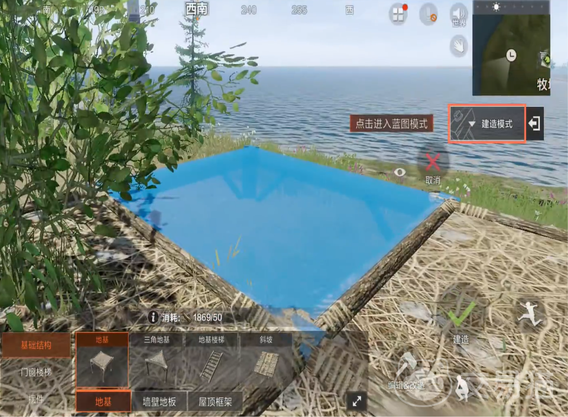 如果大家想要打开蓝图模式的话,先要进入游戏对局中。然后随着任务指引慢慢的去收集一些基础材料,当你拥有材料之后就可以点击游戏左下角的建造。进入建造模式之中,大家就可以看到一大堆目前可以制作的东西,其中包括各种地基以及防窗楼梯。